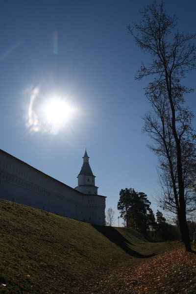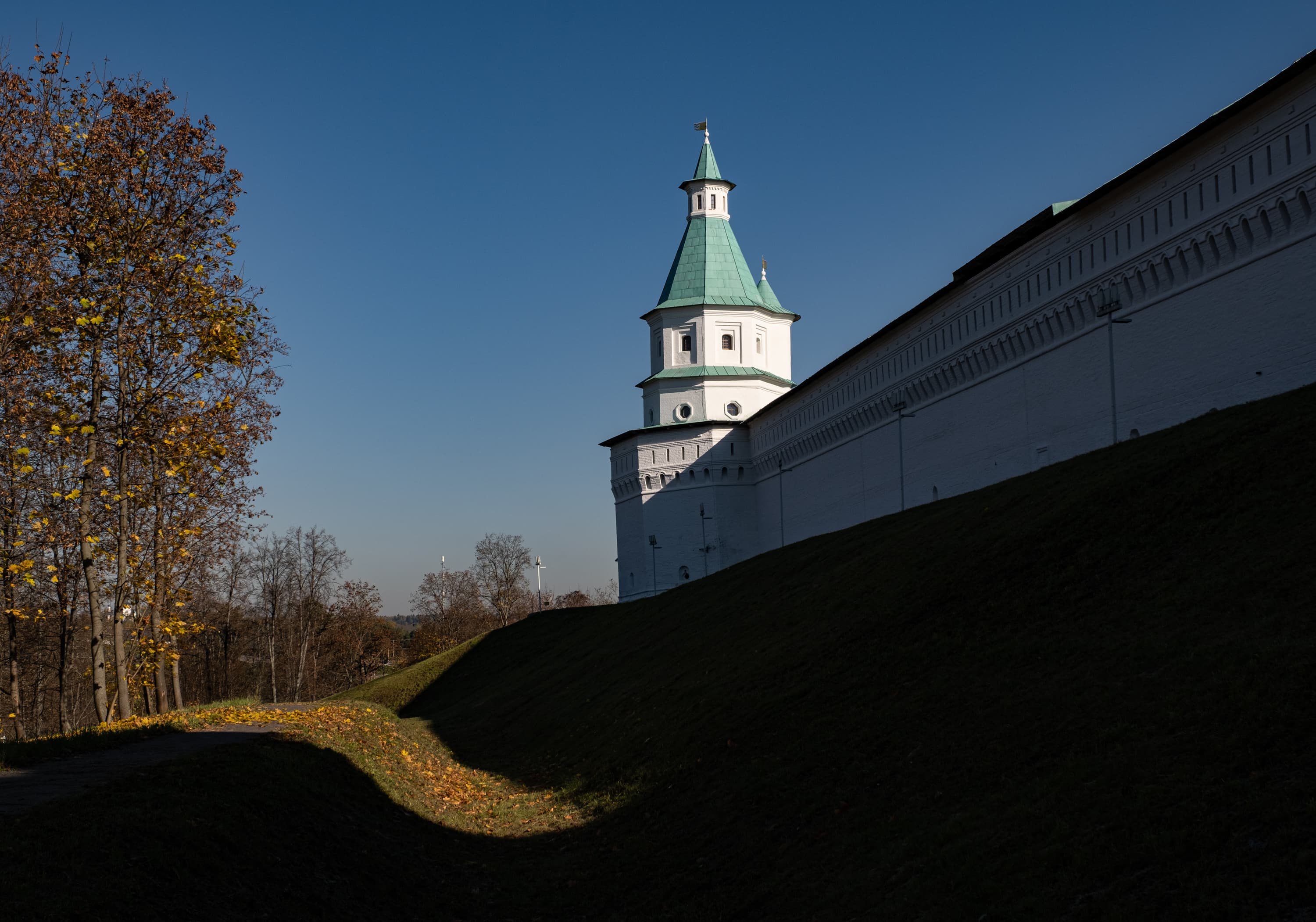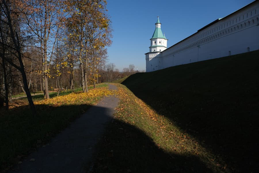 Рассмотрим теперь снимки одной сцены, сделанные при крайних и среднем положениях трансфокатора и разных значениях диафрагмы (с шагом в одну экспозиционную ступень) на мосту через реку Истра в одноименном городе у Воскресенского монастыря. Все фото — внутрикамерные JPEG без постобработки.