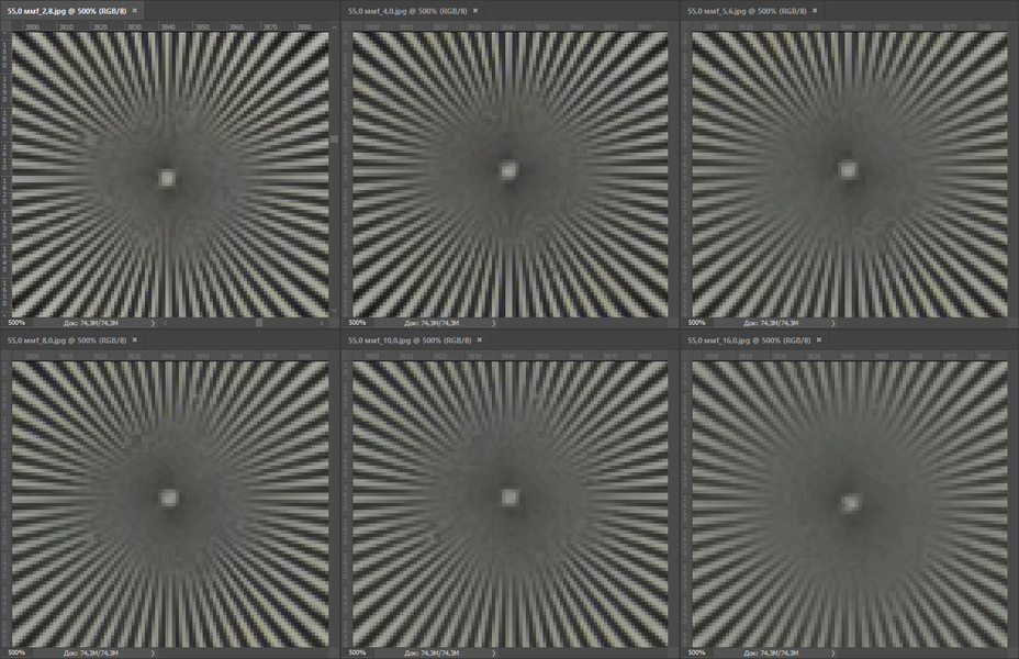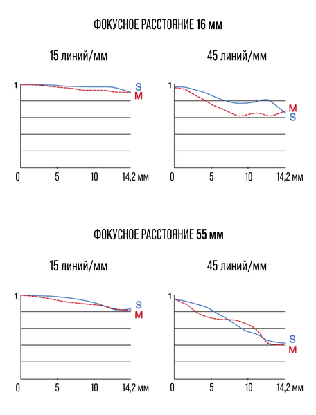 На диаграммах отчетливо видно, что при 15 линий/мм диаграммы контрастности довольно привлекательны, но при 45 линиях/мм становятся менее впечатляющими, демонстрируя падение детализации на периферии кадра почти на 20% при ФР 16 мм и почти на 60% — при ФР 55 мм.