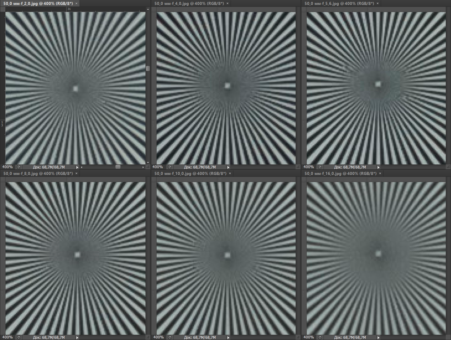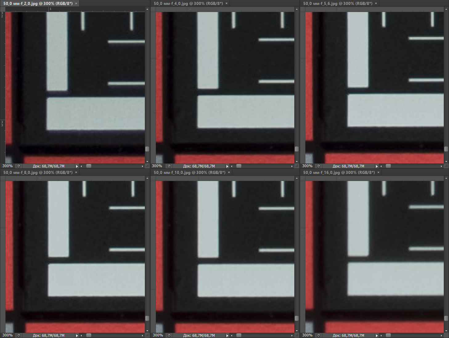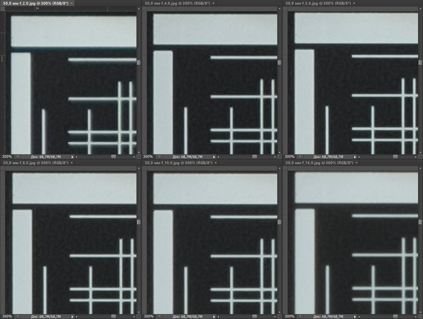 | на всех скриншотах верхний ряд: f/2 — f/4 — f/5,6, нижний ряд: f/8 — f/10 — f/16 | |