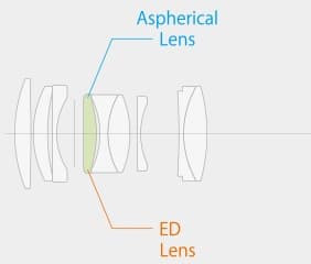 ![]() | Объектив состоит из 9 элементов в 7 группах, включая асферическую линзу из сверхнизкодисперсионного стекла (ED), призванную предотвращать хроматические и сферические аберрации на разных дистанциях фокусировки. |