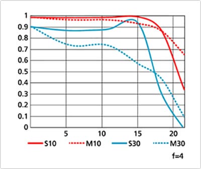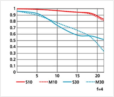 | Производитель публикует графики MTF (частотно-контрастной характеристики) объектива. Красным представлены кривые с разрешением 10 линий/мм, синим — 30 линий/мм. Сплошные линии — для сагиттальных структур (S), пунктирные — для меридиональных (M). Напомним, что в идеале кривые должны стремиться наверх, быть максимально пологими и содержать минимум изгибов. В целом, MTF выглядит неплохо на максимальном фокусном расстоянии и явно не идеально на минимальном. | |