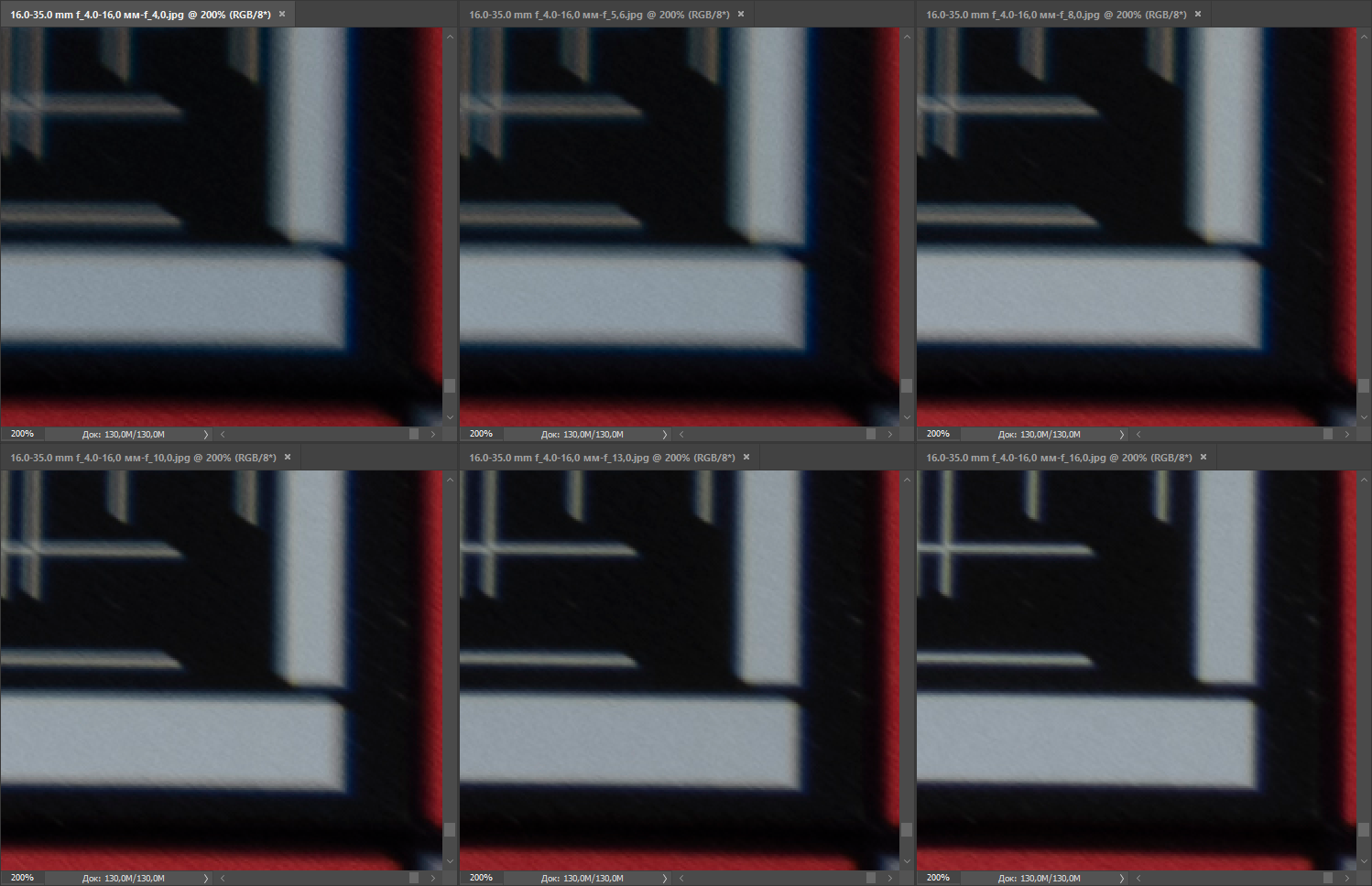 Центральная резкость очень хороша уже на максимально открытой диафрагме (третий снимок), а по мере диафрагмирования она только увеличивается с одновременным повышением качества изображения в дальних углах кадра.