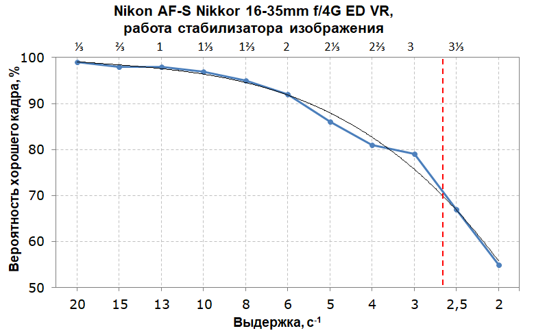Производитель заявляет эффективность стабилизатора в 4 стопа. Наш тест подтверждает чуть более 3 ступеней экспозиции, что, в целом, тоже достойный результат.