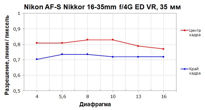На 35 мм разрешение забирается еще выше, и теперь центр кадра стабильно выдает чуть более 80% практически на всех основных значениях диафрагмы. Край кадра держится чуть выше 70%, что тоже можно считать высоким результатом. Стабильность разрешающей способности на краю также хорошая.