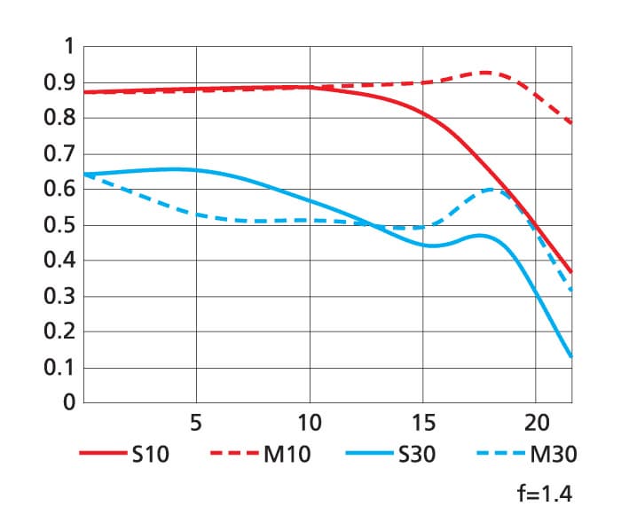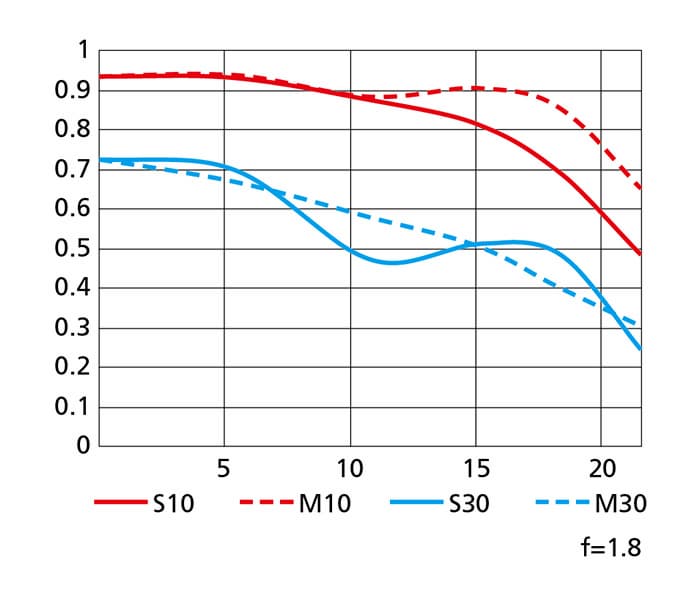 Приведем графики частотно-контрастной характеристики, или MTF, по данным производителя при максимальном раскрытии объективов. Красным цветом выделены кривые для разрешения 10 линий/мм, синим — 30 линий/мм; сплошные линии — для сагиттальных структур, пунктирные — для меридиональных. Напомним, что в идеале кривые MTF должны быть параллельны горизонтальной оси, не иметь изгибов (подъемов и завалов) и располагаться как можно выше (к единице по оси ординат).