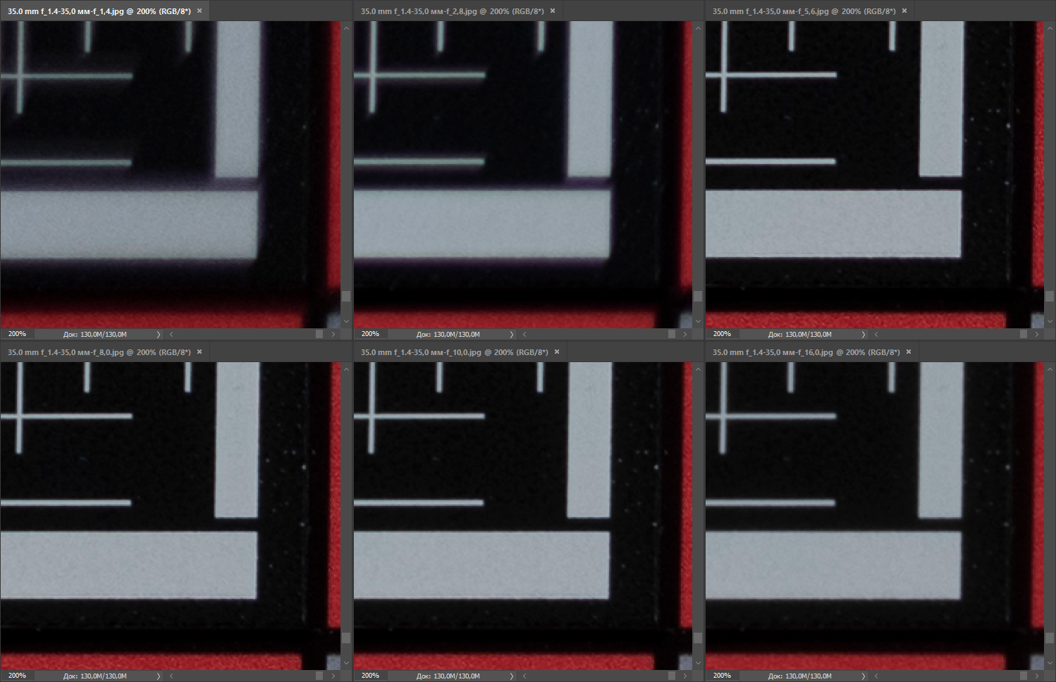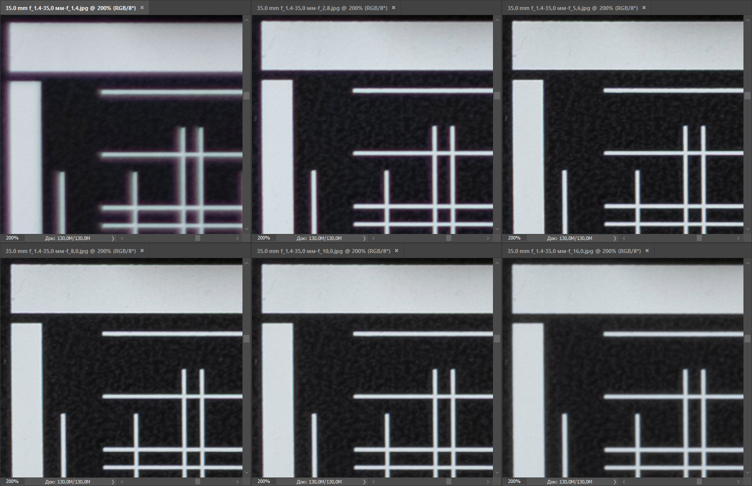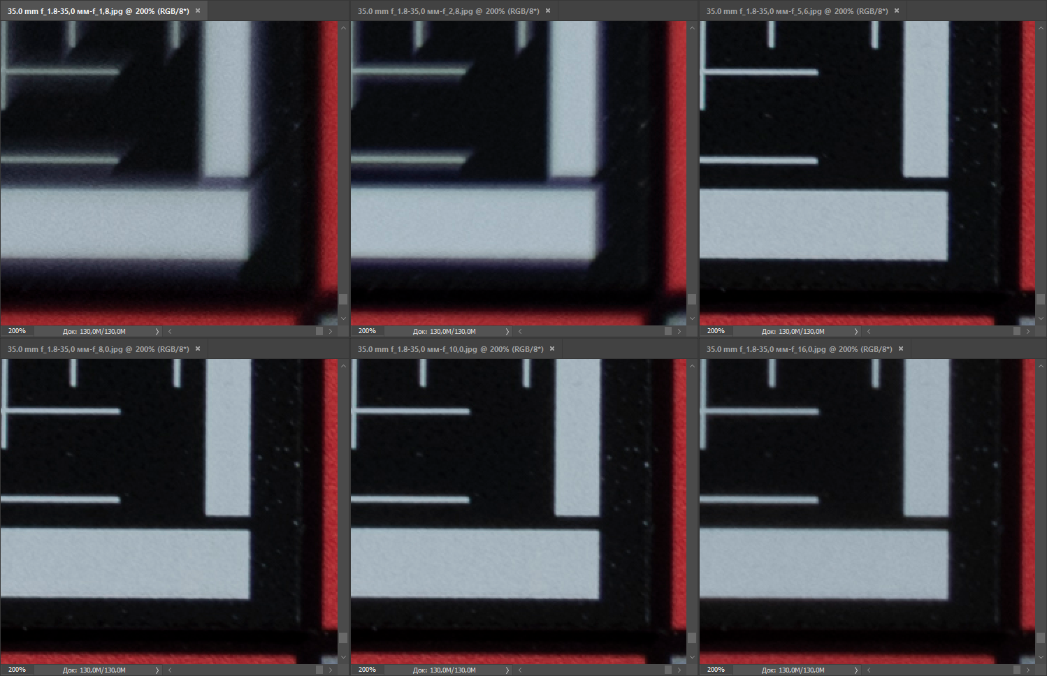 Оба испытуемых демонстрируют высокое качество изображения и хорошую резкость в центре кадра, начиная с максимального раскрытия. Резкость на краях кадра заметно выше у Nikon AF-S Nikkor 35mm f/1.8G ED. По мере диафрагмирования она возрастает, и при F11 у обоих испытуемых становится практически одинаковой. При дальнейшем диафрагмировании детализация изображения ухудшается — по-видимому, вследствие дифракции.