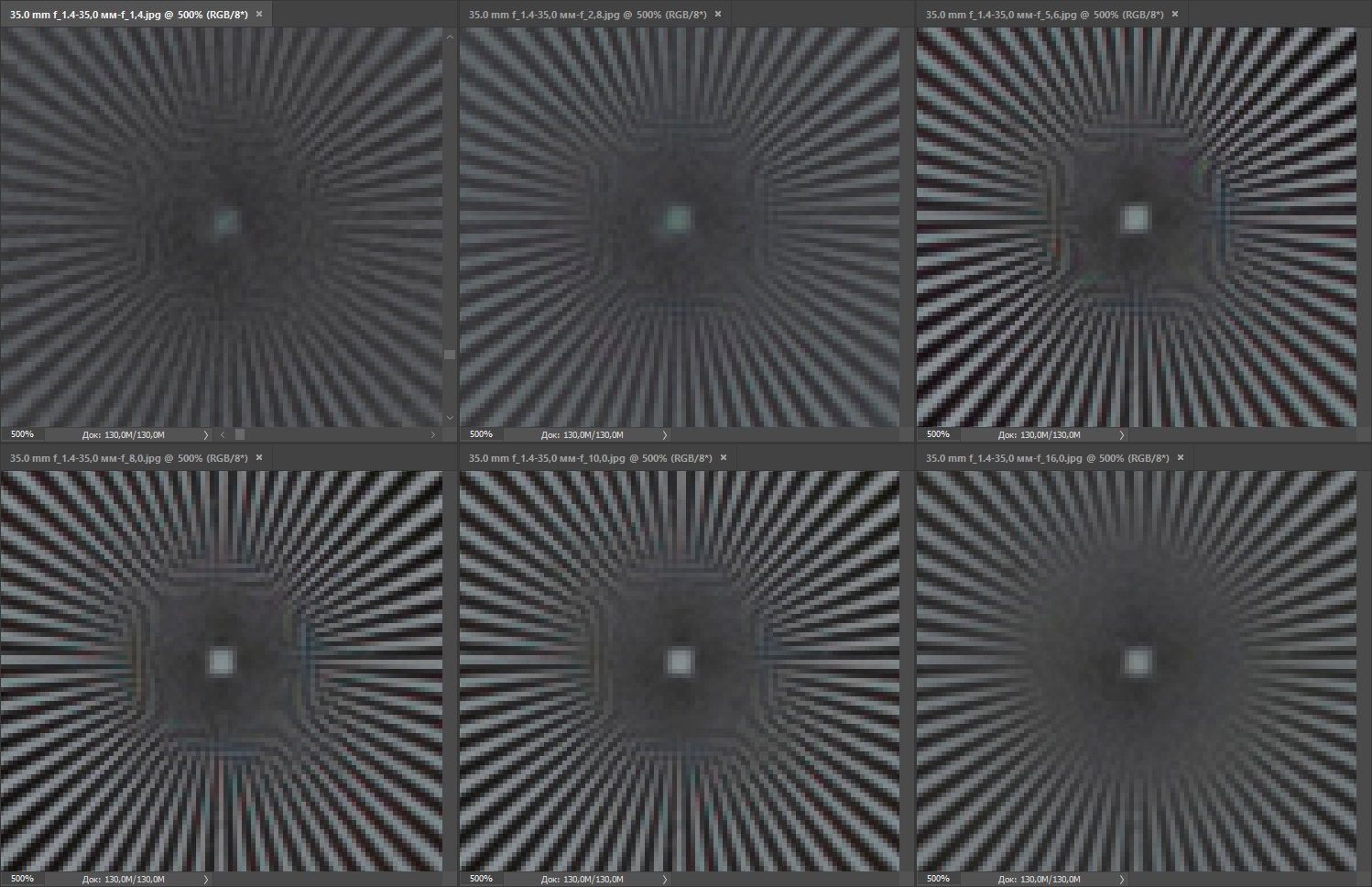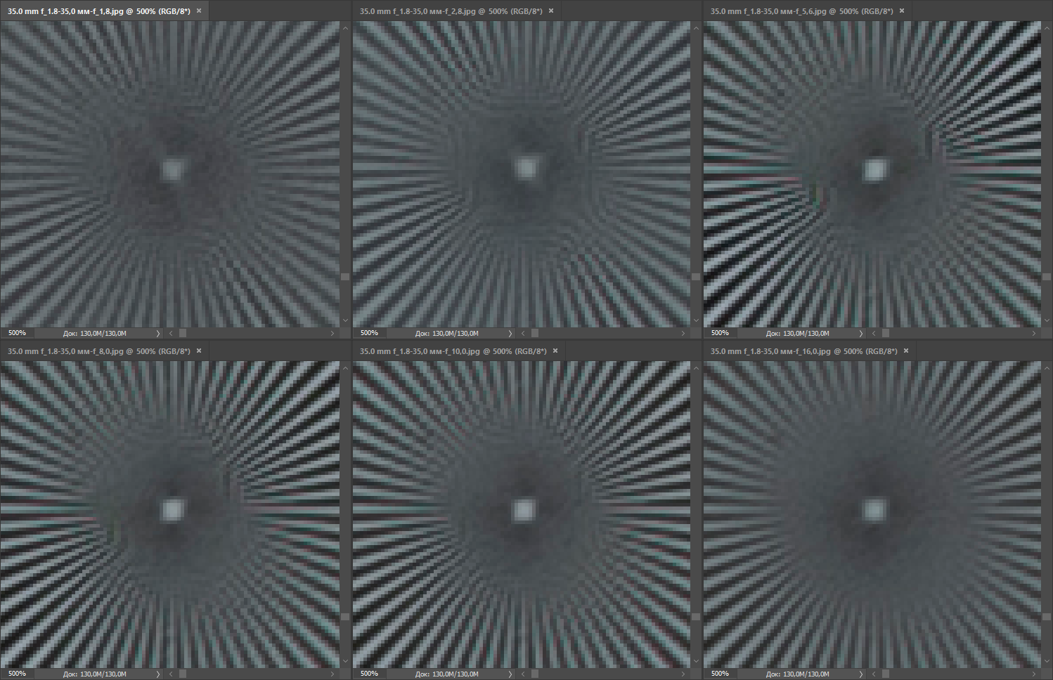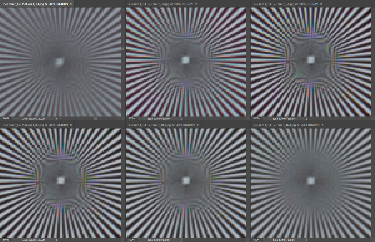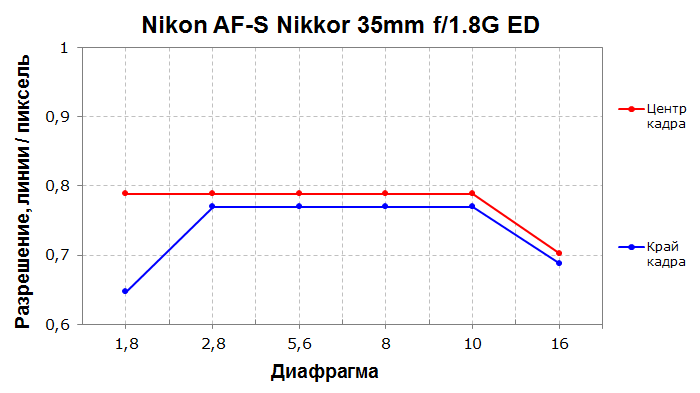 Оба испытуемых демонстрируют высокое качество изображения и хорошую резкость в центре кадра, начиная с максимального раскрытия. Резкость на краях кадра заметно выше у Nikon AF-S Nikkor 35mm f/1.8G ED. По мере диафрагмирования она возрастает, и при F11 у обоих испытуемых становится практически одинаковой. При дальнейшем диафрагмировании детализация изображения ухудшается — по-видимому, вследствие дифракции.