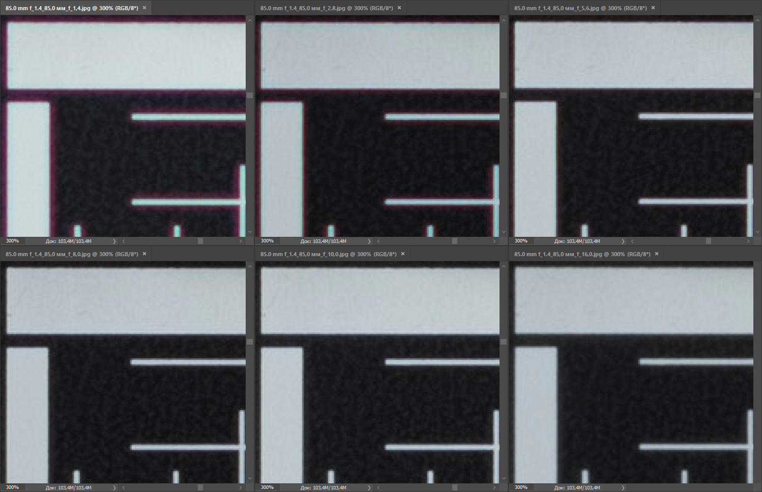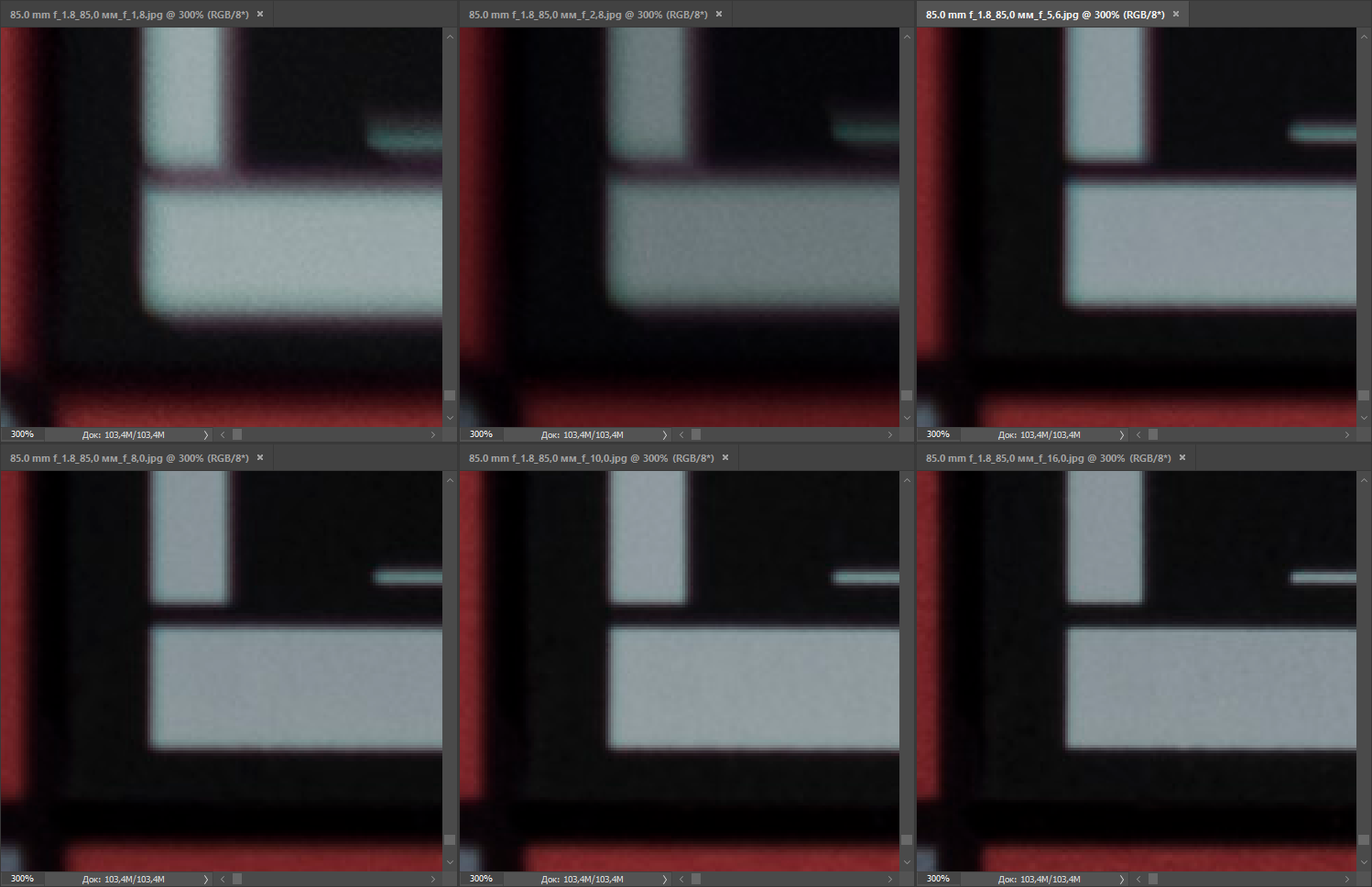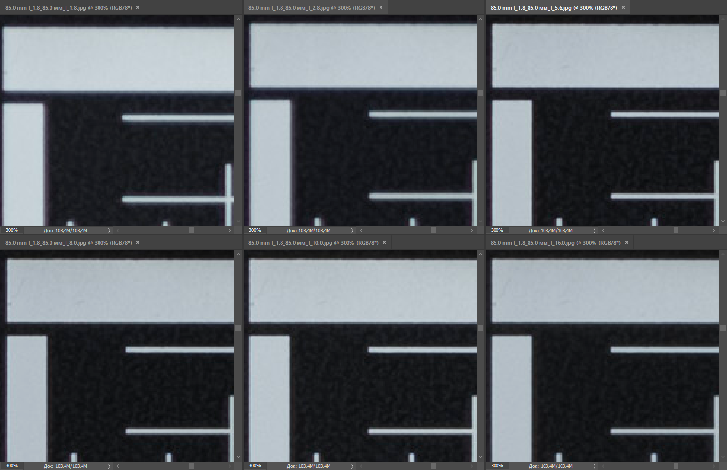 Проработка деталей в центре великолепная во всех случаях. Вместе с тем, оба соперника отличаются сильным виньетированием на открытой диафрагме, но сильнее этот эффект выражен у Nikon AF-S Nikkor 85mm f/1.8G (на глаз — до −2 EV против примерно −1,5 EV у конкурента). В обоих случаях виньетирование корректируется приложением специфического профиля, но в случае с Nikon AF-S Nikkor 85mm f/1.8G оно не излечивается до конца. Впрочем, эти остаточные явления несложно исправить при постобработке. Эффект краевого затемнения сохраняется вплоть до F5,6, а при более сильном диафрагмировании уже не определяется.