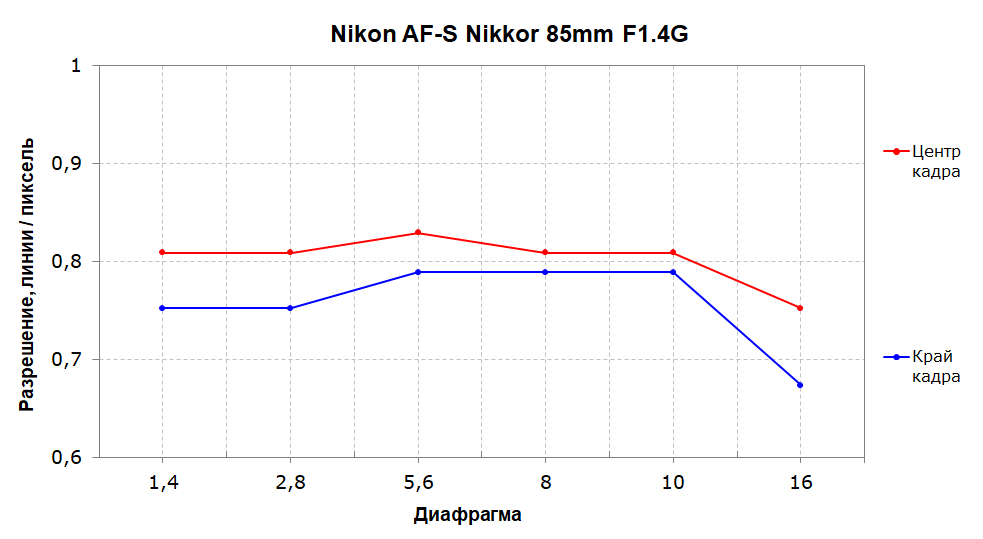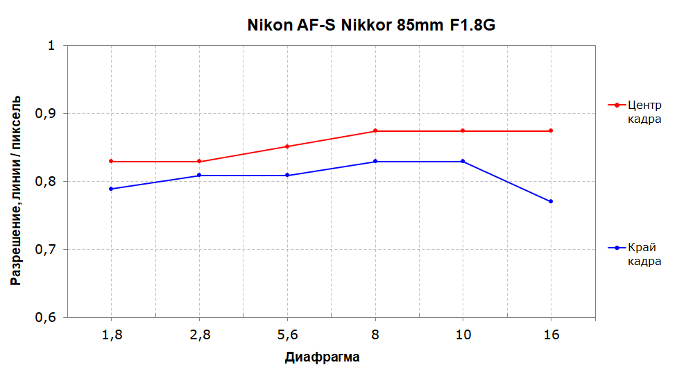 Оба объектива могут похвастать высокой разрешающей способностью на уровне 80% и хорошей резкостью на краях кадра: разрешение в центре и на краю различается незначительно. Однако Nikon AF-S Nikkor 85mm f/1.8G демонстрирует куда бо́льшую стабильность разрешающей способности и ее более высокое среднее значение: во всем исследованном диапазоне диафрагмирования разрешение не опускается ниже 70%, что выглядит очень достойно.
