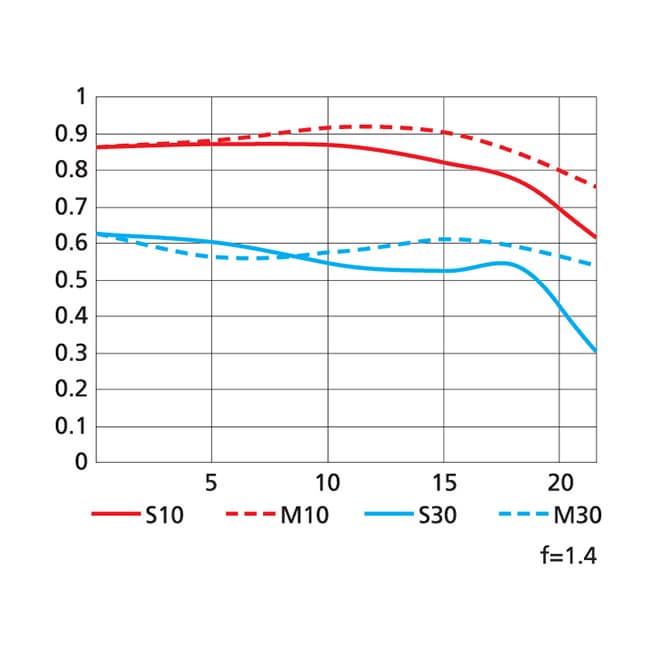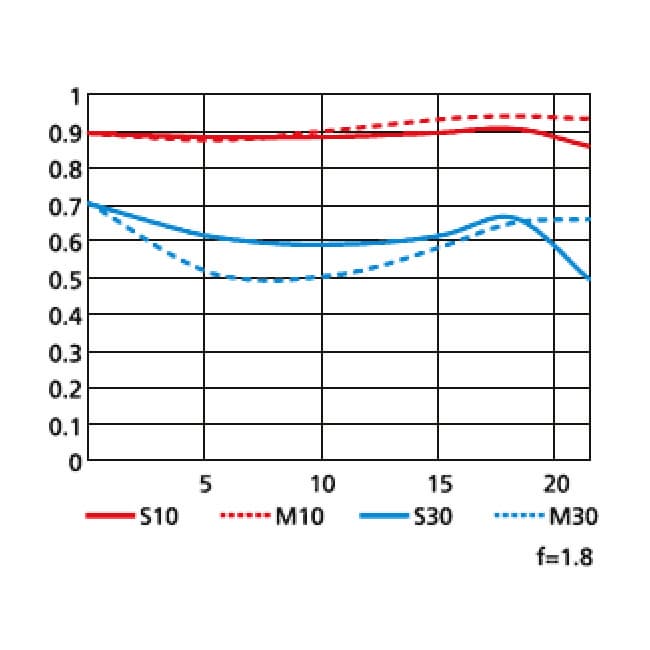 Приведем ниже графики частотно-контрастной характеристики, или MTF, по данным производителя при максимальном раскрытии объективов. Красным цветом выделены кривые для разрешения 10 линий/мм, синим — 30 линий/мм; сплошные линии — для сагиттальных структур, пунктирные — для меридиональных. Напомним, что в идеале кривые MTF должны быть параллельны горизонтальной оси, не иметь изгибов (подъемов и завалов) и располагаться как можно выше (к единице по оси ординат).
