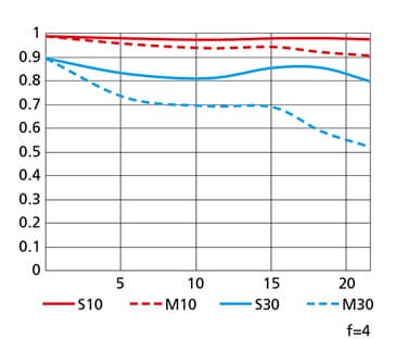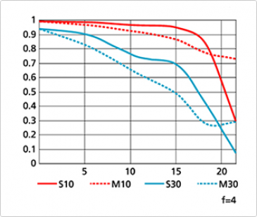 Производитель публикует кривые MTF, как заведено, для минимального и максимального фокусных расстояний. В нашем случае это означает, что сравнивать можно только первые графики, поскольку картина ЧКХ при 70 мм и 120 мм будет отличаться слишком сильно. Красные кривые приведены для разрешения 10 линий/мм, голубые — для 30 линий/мм; сплошные — для сагиттальных структур, пунктирные — для диагональных. Напомним, что у идеальной оптики они должны располагаться как можно выше, быть максимально пологими и не содержать завалов и изгибов.