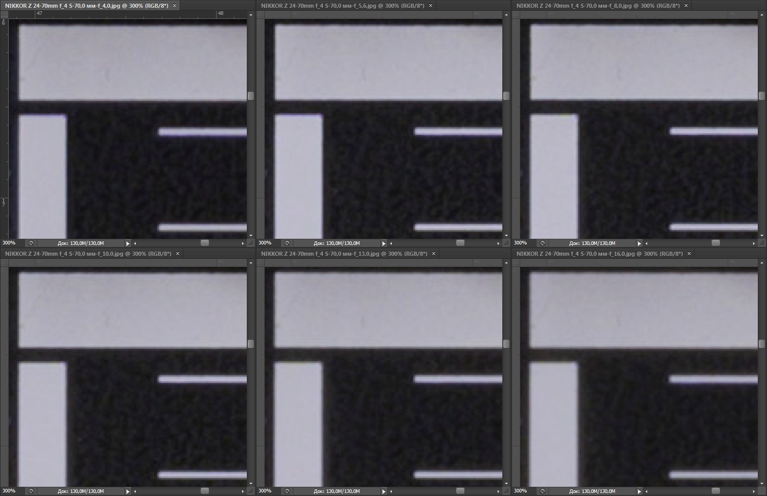 По резкости в центре между соперниками паритет, а на периферии Nikon Z Nikkor 24-70mm f/4 S отстает, и ему удается приблизиться к Nikon AF-S Nikkor 24-120mm f/4G ED VR лишь при субмаксимальном диафрагмировании (F11), да и то лишь в центре. На периферии разница в резкости между конкурентами отчетливо определяется при всех значениях диафрагмы.