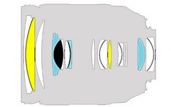 | 14 элементов в 11 группах, включая 1 сверхнизкодисперсионный, 3 асферических и 1 сверхнизкодисперсионный асферический | 17 элементов в 13 группах, включая 2 сверхнизкодисперсионных и 3 асферических |