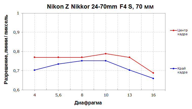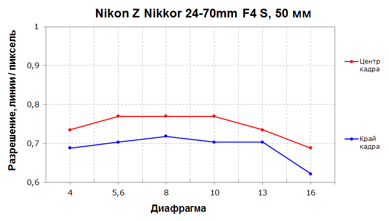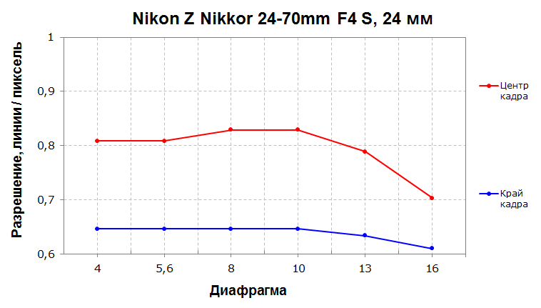 Разрешающая способность обоих объективов в широкоугольном положении почти одинаковая, но лишь в центре кадра. По разрешению на краю кадра Nikon Z Nikkor 24-70mm f/4 S заметно проигрывает зеркальному аналогу Nikon AF-S Nikkor 24-120mm F4G ED VR, отрабатывая лишь около 65% сенсора. При этом 24-120mm выдает 80% при средних положениях диафрагмы по всему полю кадра и демонстрирует очень стабильную кривую разрешения, будто «зарезанную» предельным разрешением сенсора. Складывается впечатление, что объектив способен разрешать больше.