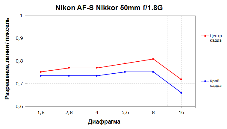 Картина MTF у Nikon AF-S Nikkor 50mm f/1.8G менее привлекательная, чем у его беззеркального соперника; это особенно заметно при воспроизведении сагиттальных структур 30 линий/мм.