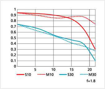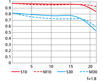 Приведем графики частотно-контрастной характеристики, или MTF, по данным производителя при максимальном раскрытии объективов. Красным цветом выделены кривые для разрешения 10 линий/мм, синим — 30 линий/мм; сплошные линии — для сагиттальных структур, пунктирные — для меридиональных. Напомним, что в идеале кривые MTF должны быть параллельны горизонтальной оси, не иметь изгибов (подъемов и завалов) и располагаться как можно выше (к единице по оси ординат).