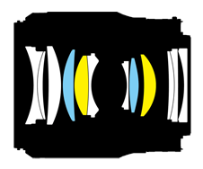Внутреннее устройство объективов отличается весьма сильно. Беззеркальный Nikkor содержит 12 стекол в 9 группах, включая 2 асферических элемента (голубые), 2 линзы из материала со сверхнизкой дисперсией (желтые) и несколько линз с «фирменным» нанокристаллическим покрытием (Nano Crystal Coat). Конкурент для зеркальной системы устроен существенно проще: 7 элементов в 6 группах, включая всего одну асферическую линзу (голубая).