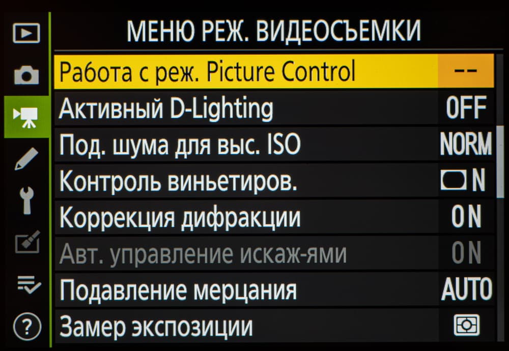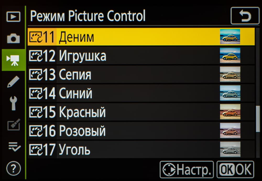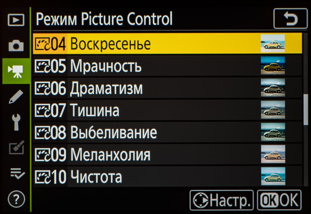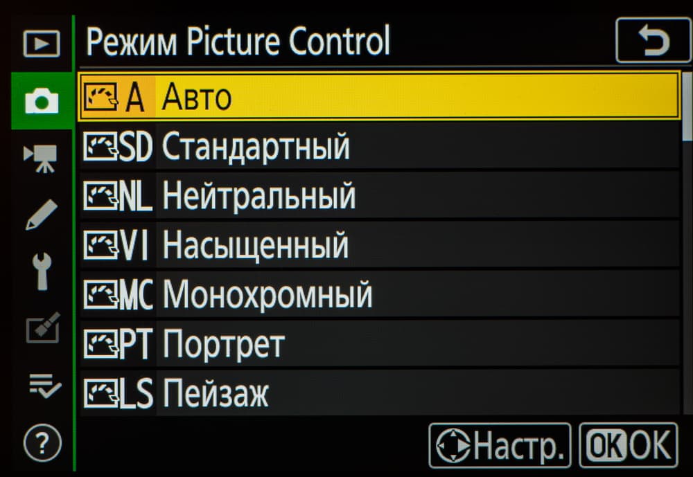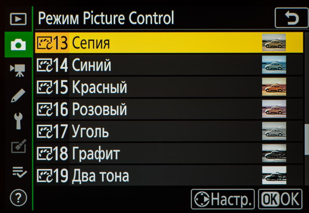 | Эффекты изображения (Picture Control) | «Авто», «Стандартный», «Нейтральный», «Насыщенный», «Монохромный», «Портрет», «Пейзаж» и «Равномерный», творческие режимы Picture Control («Сон», «Утро», «Поп», «Воскресенье», «Мрачность», «Драматичность», «Тишина», «Выбеливание», «Меланхолия», «Чистота», «Деним», «Игрушка», «Сепия», «Синий», «Красный», «Розовый», «Уголь», «Графит», «Сажа») |