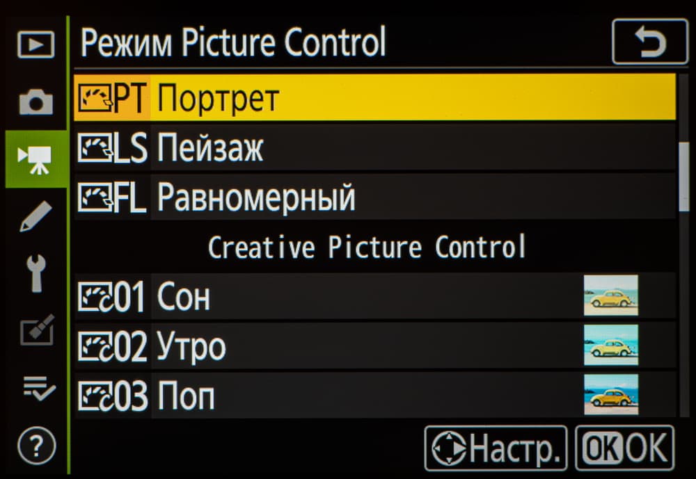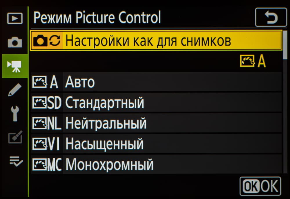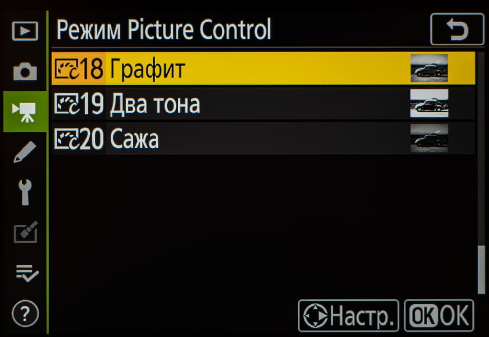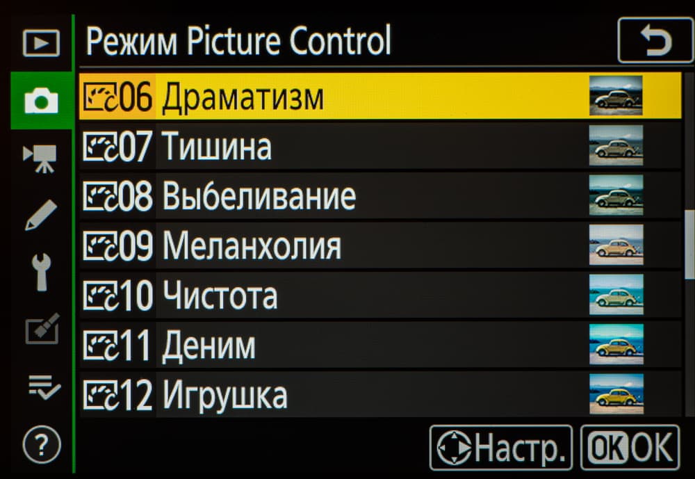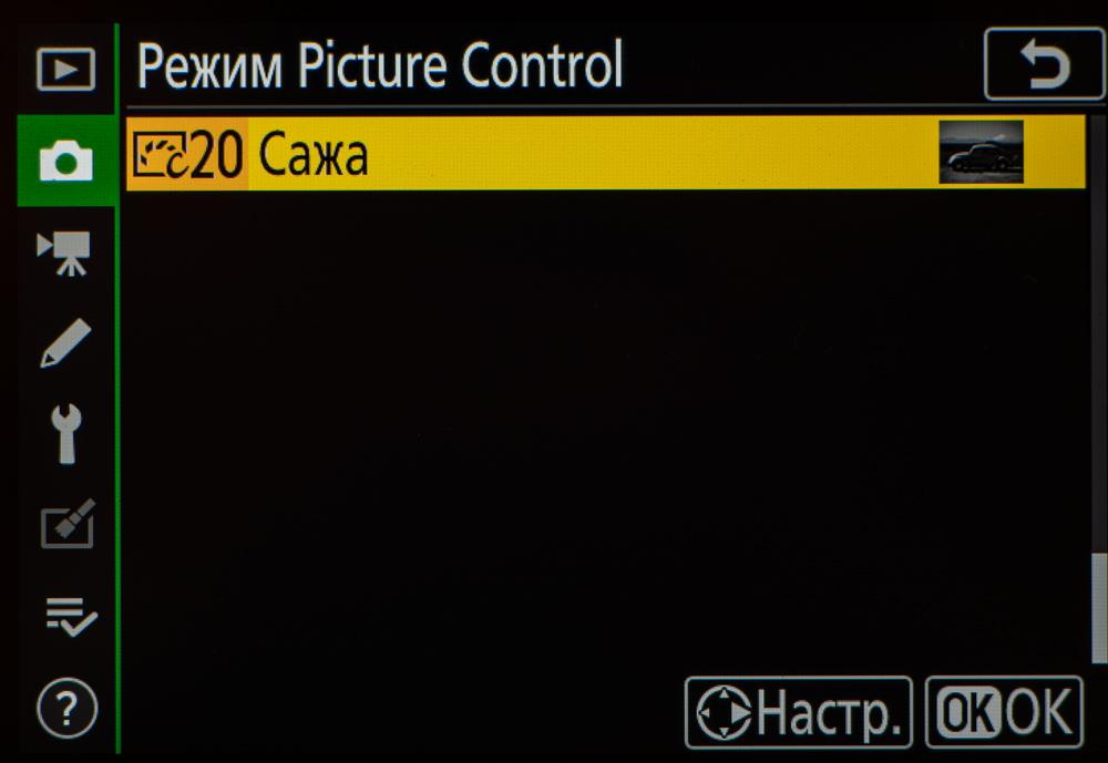 | Эффекты изображения (Picture Control) | «Авто», «Стандартный», «Нейтральный», «Насыщенный», «Монохромный», «Портрет», «Пейзаж» и «Равномерный», творческие режимы Picture Control («Сон», «Утро», «Поп», «Воскресенье», «Мрачность», «Драматичность», «Тишина», «Выбеливание», «Меланхолия», «Чистота», «Деним», «Игрушка», «Сепия», «Синий», «Красный», «Розовый», «Уголь», «Графит», «Сажа») |
