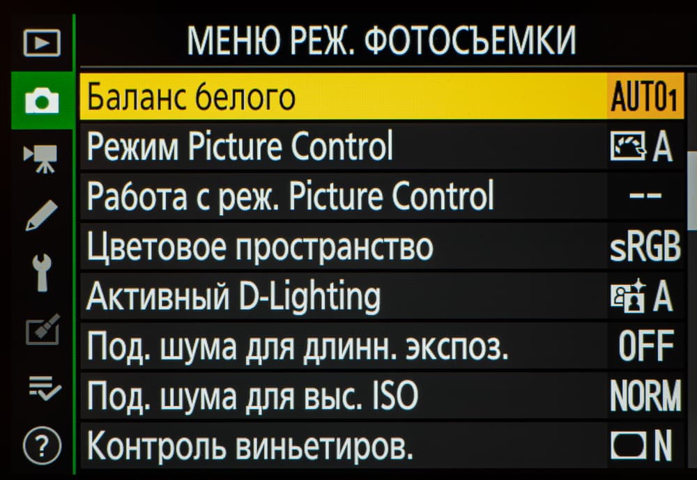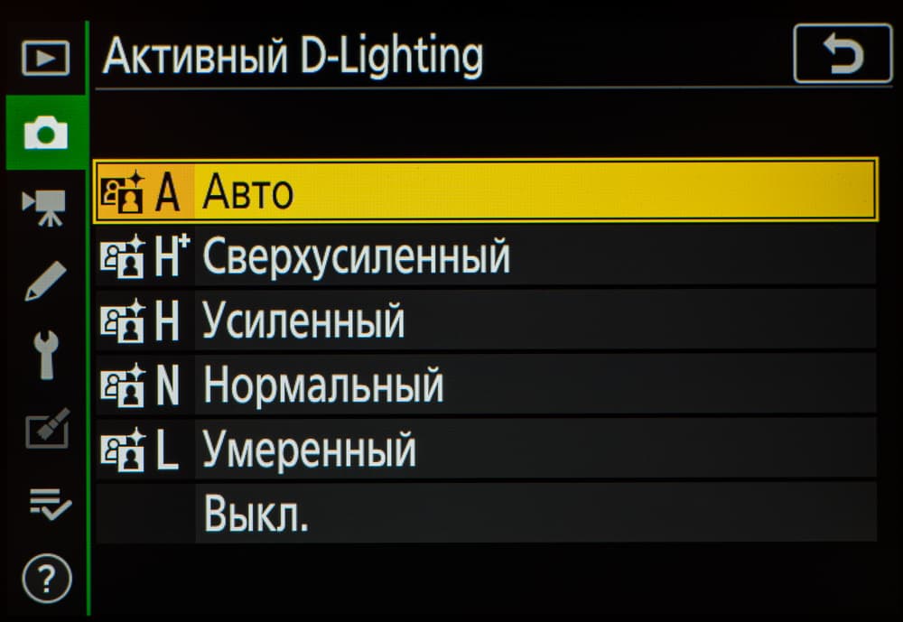 | Active D-Lighting (расширение динамического диапазона) | авто, сверхусиленный, усиленный, нормальный, умеренный, выключено |
