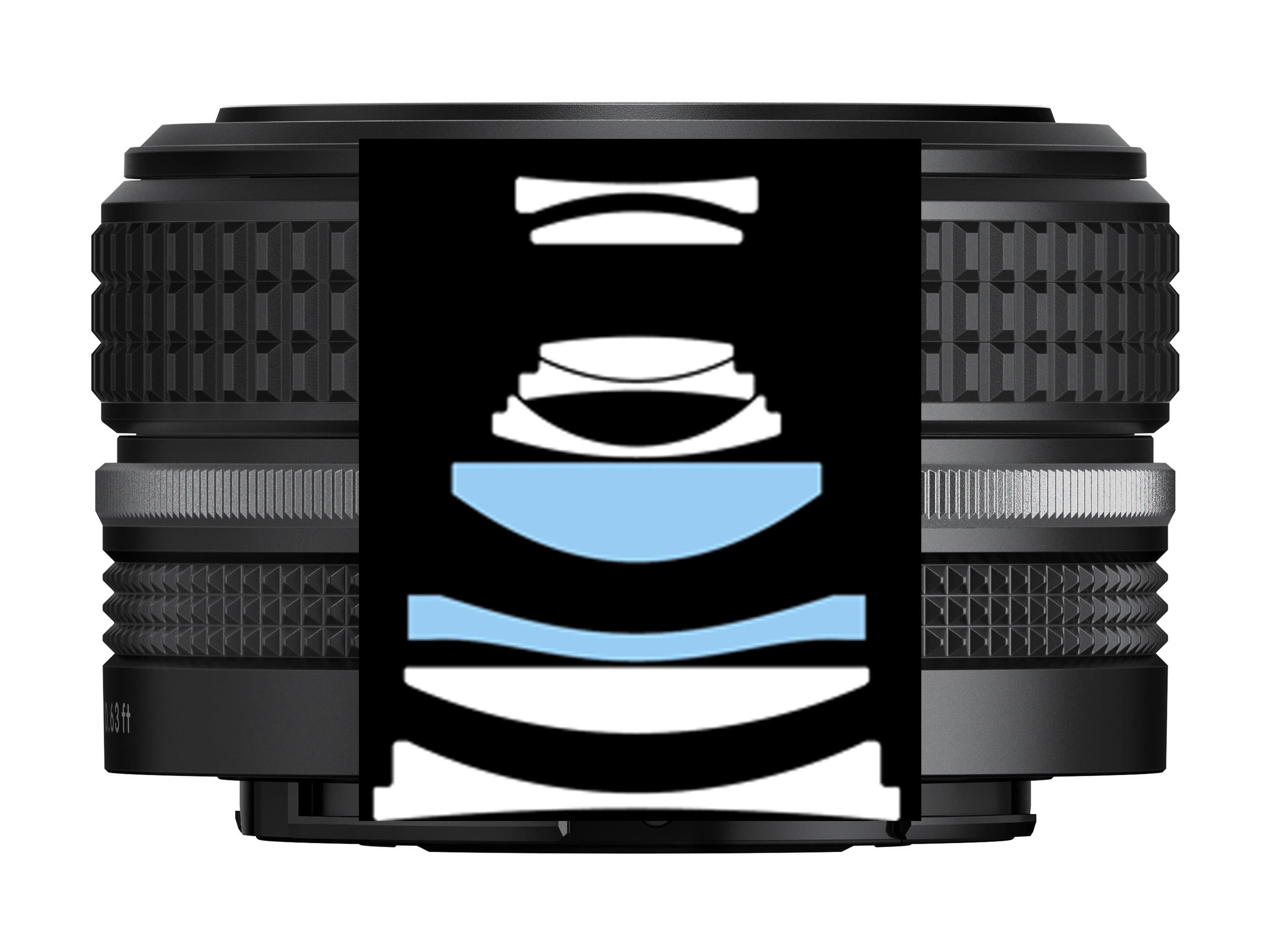 Среди стекол выделяются два асферических элемента (помечены голубым). Напомним, что асферика компенсирует неравномерности рефракции объектива в поле его зрения, тем самым нивелируя проявление сферических аберраций и увеличивая резкость получаемой картинки. А вот модных линз из сверхнизкодисперсионного стекла (для борьбы с хроматическими аберрациями) в составе нашего героя нет.