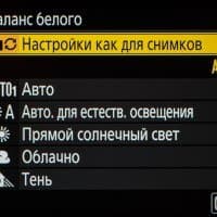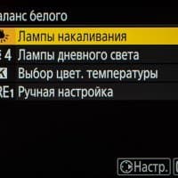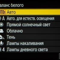| Баланс белого | авто (3 типа), авто для естественного освещения, солнечный свет, облачно, в тени, лампы накаливания, лампы дневного света (7 типов), вспышка, выбор цветовой температуры (2500 — 10 000 К), ручная установка (6 значений)3 |