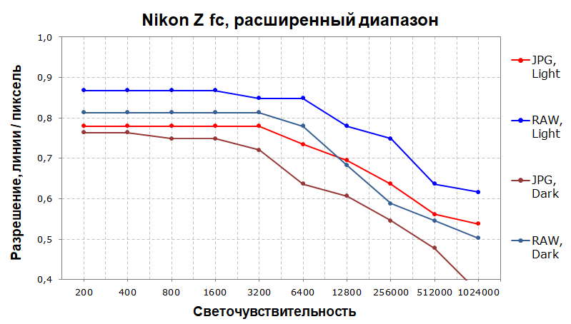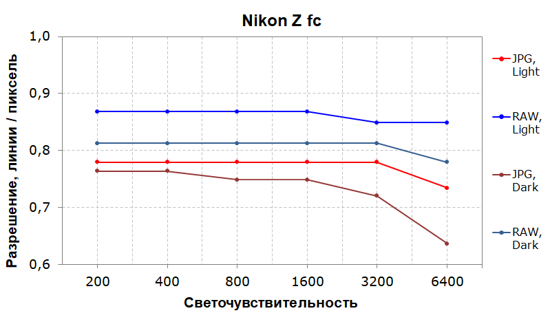 RAW в целом получается лучше JPEG в обеих сценах, что говорит о не очень хорошей внутрикамерной обработке. До ISO 3200 практически все кривые держатся стабильно: RAW — на уровне 85%, JPEG — на уровне 77%. С дальнейшим увеличением светочувствительности разрешающая способность начинает достаточно быстро падать.