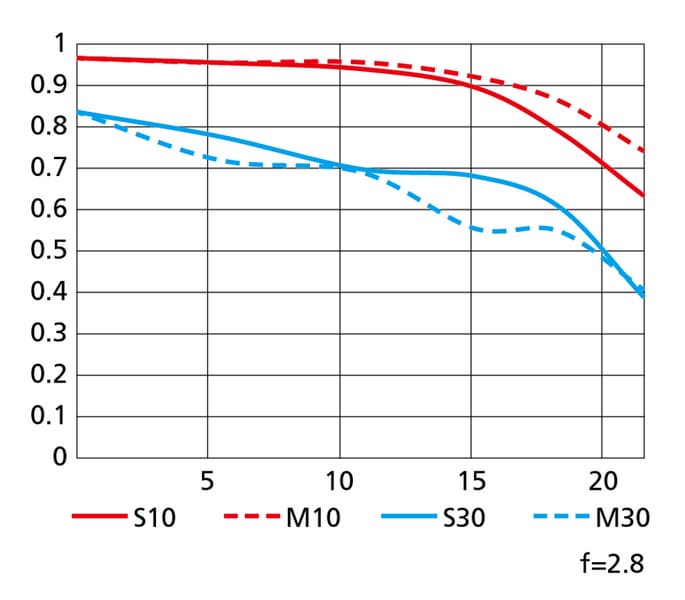 Кривые ЧКХ (Modular Transfer Function, MTF) на приведенной ниже диаграмме маркированы красным для 10 линий/мм, голубым — для 30 линий/мм; сплошные линии — для сагиттальных структур, пунктирные — для меридиональных. В идеале все они должны располагаться максимально высоко по оси коэффициента контрастности, быть параллельными оси расстояний от центра кадра и не содержать завалов.