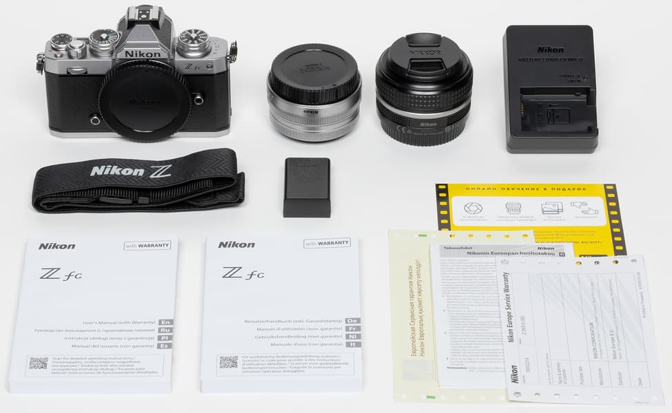 Помимо обещанного на лицевой стороне упаковки, внутри коробки обнаруживаются также фирменный шейный ремень, батарея, зарядное устройство и сопроводительные документы. На фото, приведенном выше, справа от камеры показаны два штатных объектива: Nikkor Z DX 16-50mm F3.5-6.3 VR (серебристый) и Nikkor Z 28mm F2.8 SE (черный), анонсированный за месяц до героини обзора. В наш комплект был включен второй, 28-миллиметровый объектив. Подробнее мы расскажем о нем в следующих разделах материала.