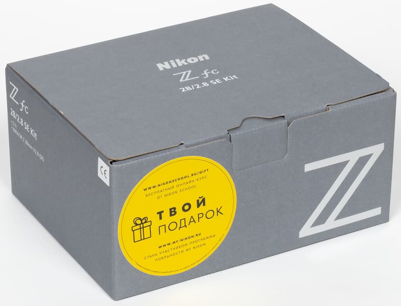 Аппарат в комплекте с объективом Nikkor Z 28mm F2.8 SE упакован в коробку с лаконичным, но приятным глазу оформлением.