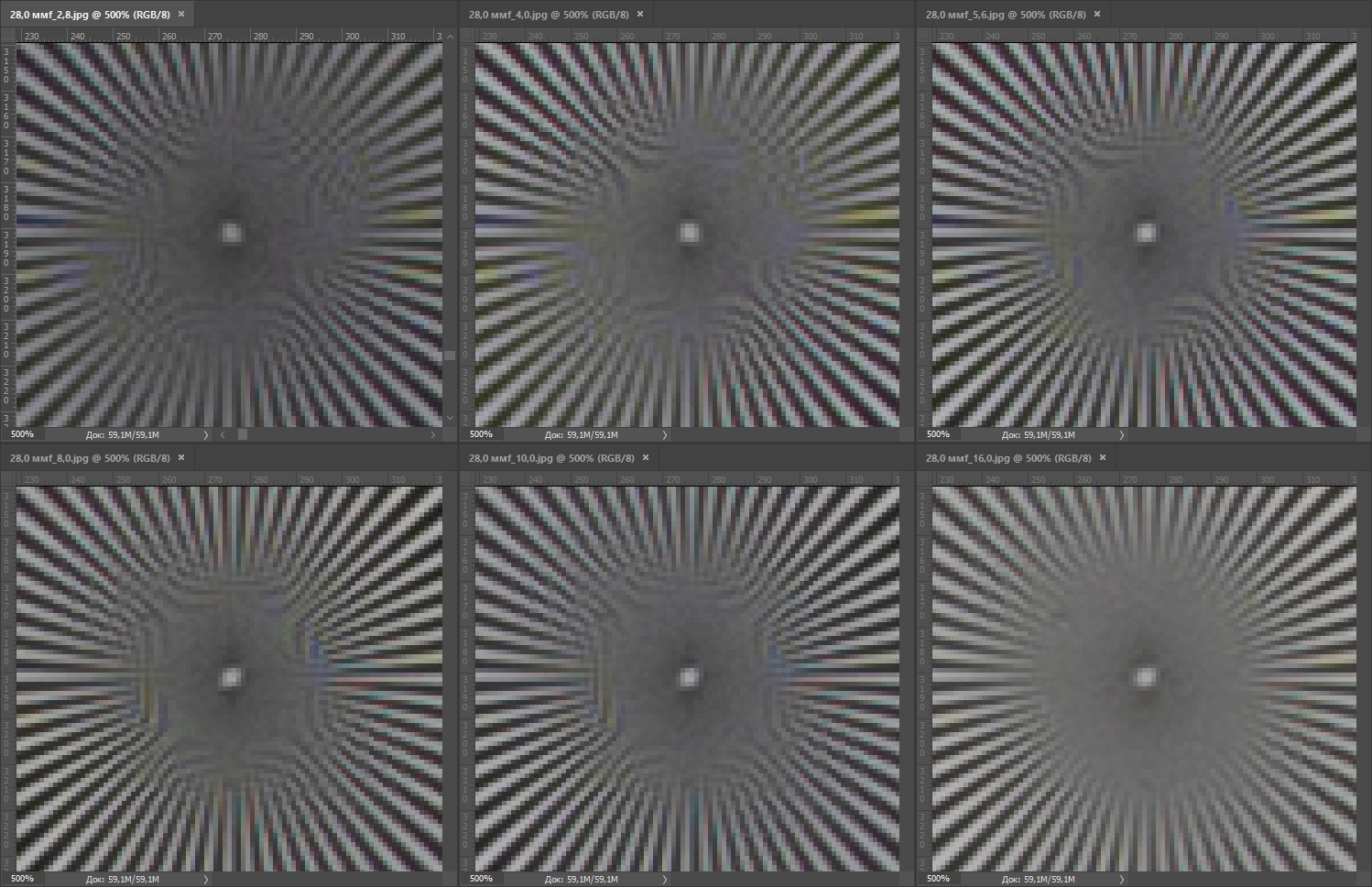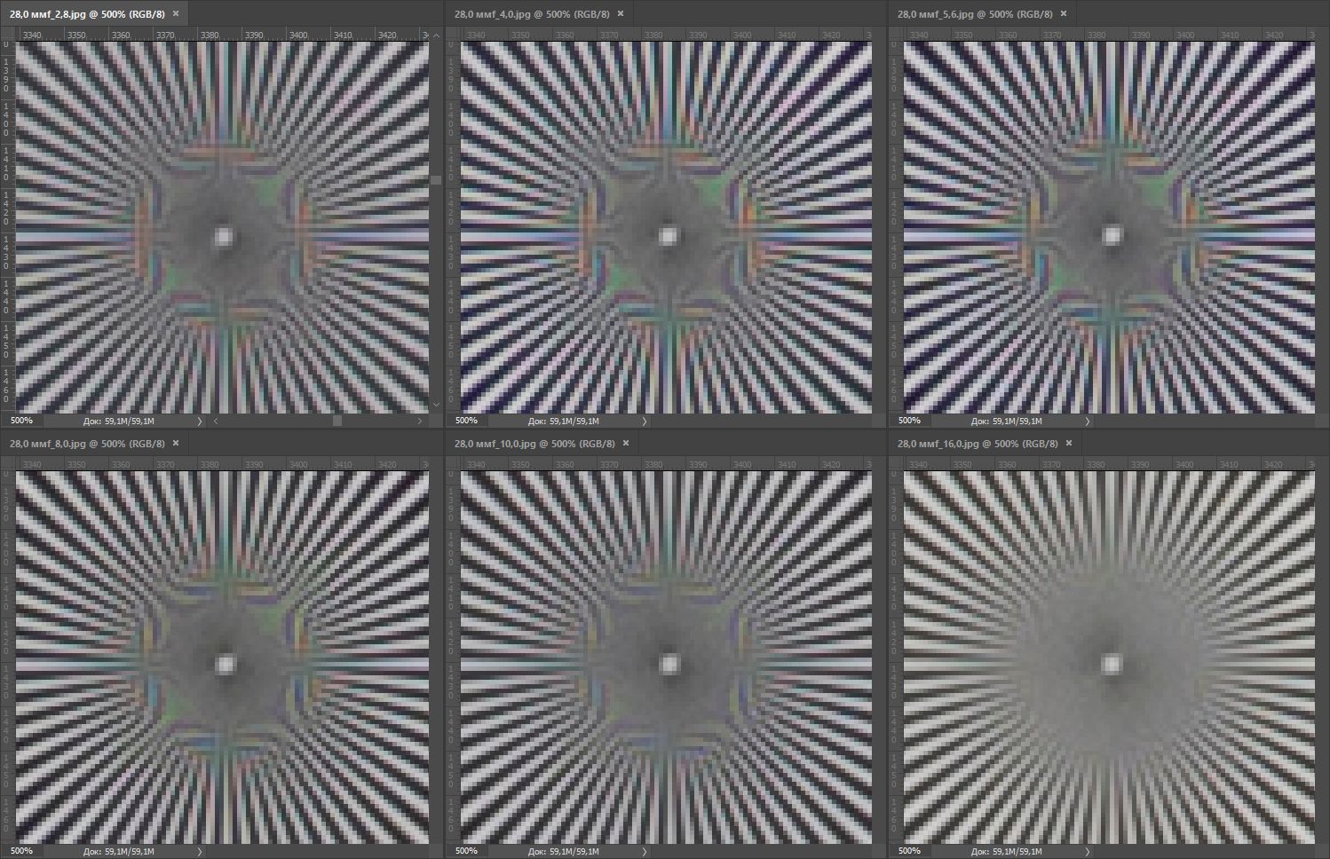 Как видно из рисунка, при отображении 30 линий на дюйм в центре кадра следует ожидать довольно хорошей детализации, а вот на максимальном удалении от него происходит падение резкости почти вдвое. Впрочем, нельзя ждать от бюджетной оптики того же, чего мы ожидаем от профессиональной.