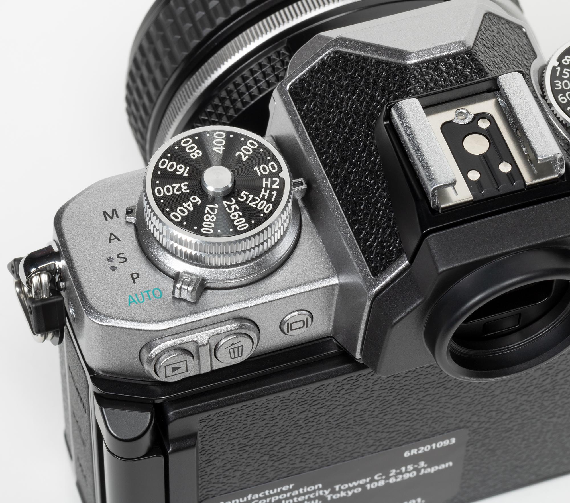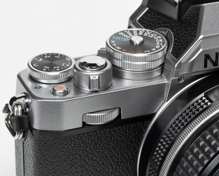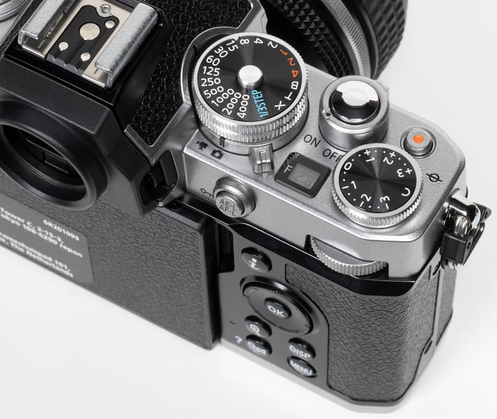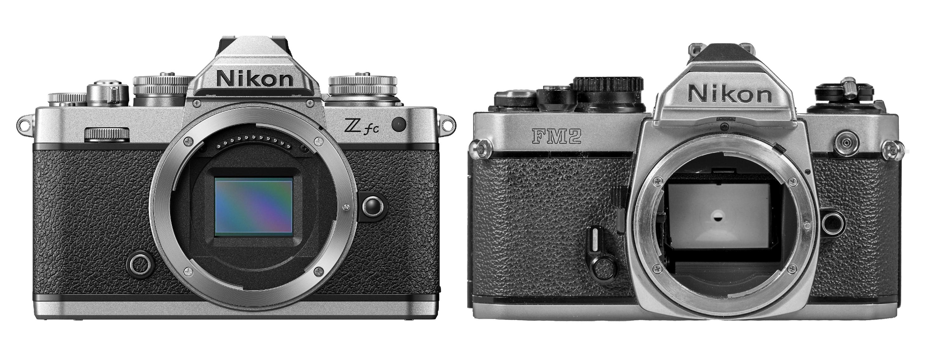 Nikon Z fc немного у́же и выше пленочной Nikon FM2 (135×94×44 мм против 143×90×60 мм), но это не принципиально, а важно другое: у новинки три колеса и два диска установки параметров. Такое не снилось механической камере, в которой невозможно устанавливать значения диафрагмы и ISO, вводить компенсацию экспозиции (и нет ни дисплея, ни кнопок сзади).