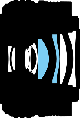 Оптическая среда примечательная. На картинке выше хорошо видно, что это один из вариантов квазисимметричной ретрофокусной схемы, то есть перевернутого объектива (бывшая задняя линза смотрит во внешний мир, а передняя — на сенсор), причем двояковыпуклые элементы (включая голубые асферические), обеспечивающие основную силу рефракции системы, расположены между наружными двояковогнутыми. Ретрофокусные схемы очень удачны, но их использование в пленочную эпоху ограничивалось дальномерными камерами из-за короткого рабочего отрезка, который в зеркальных аппаратах не оставляет места для размахов поднимающегося зеркала. Но с распространением цифровых беззеркалок ретрофокусные объективы стали возрождаться в новом качестве (и изрядном количестве).