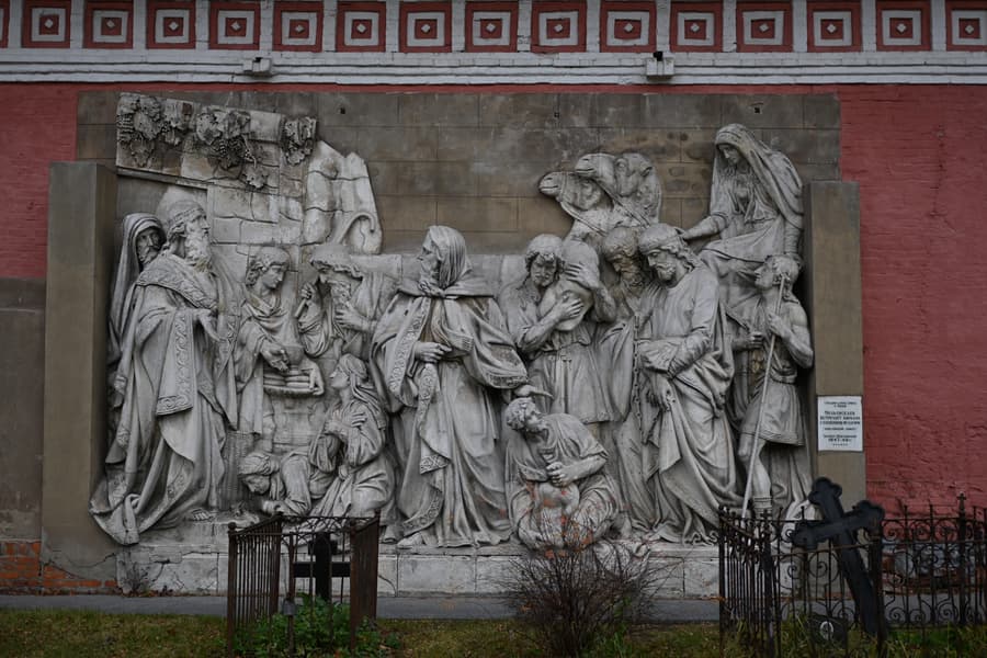 Примечательно, что светотональные переходы камера отрабатывает очень хорошо. При съемке в дождливую пасмурную погоду только это качество и позволяет получать пригодные снимки, например, скульптур. На фото внизу — один из барельефов из старого (оригинального) храма Христа Спасителя, ныне украшающий кладбищенскую стену московского Донского монастыря.