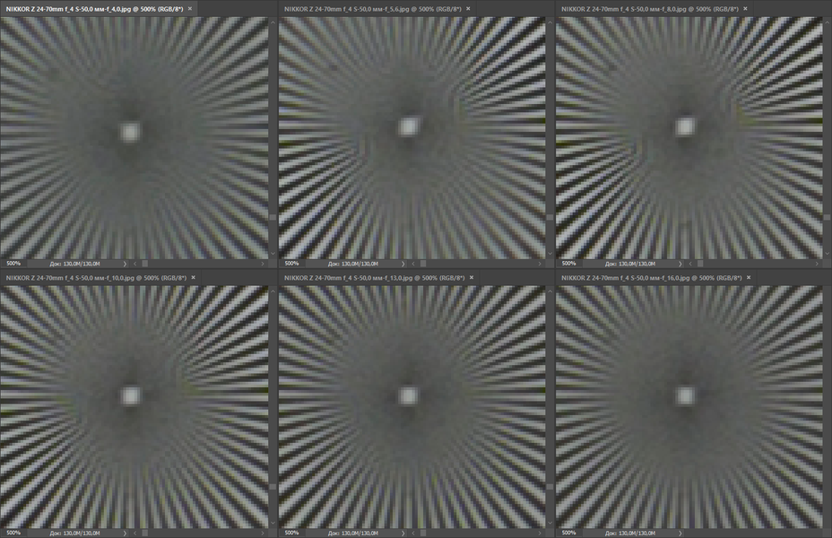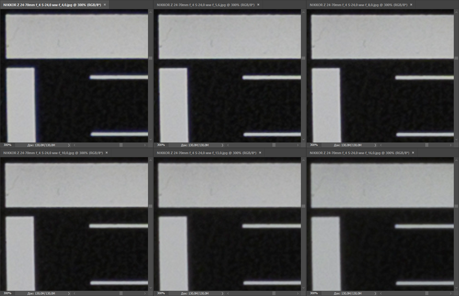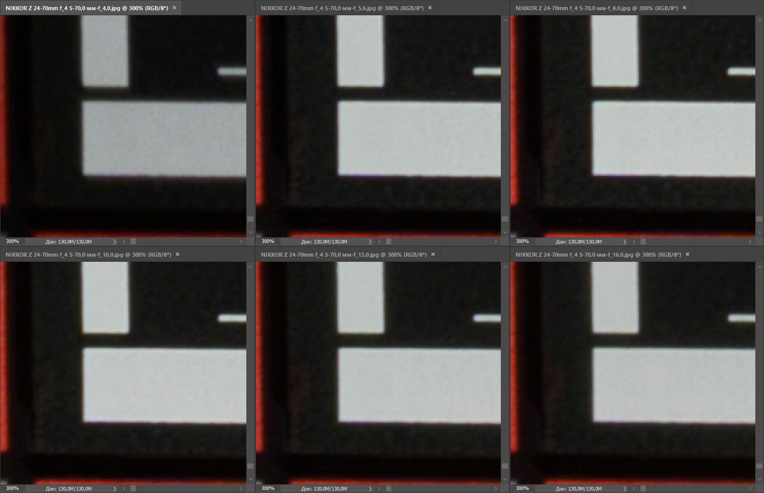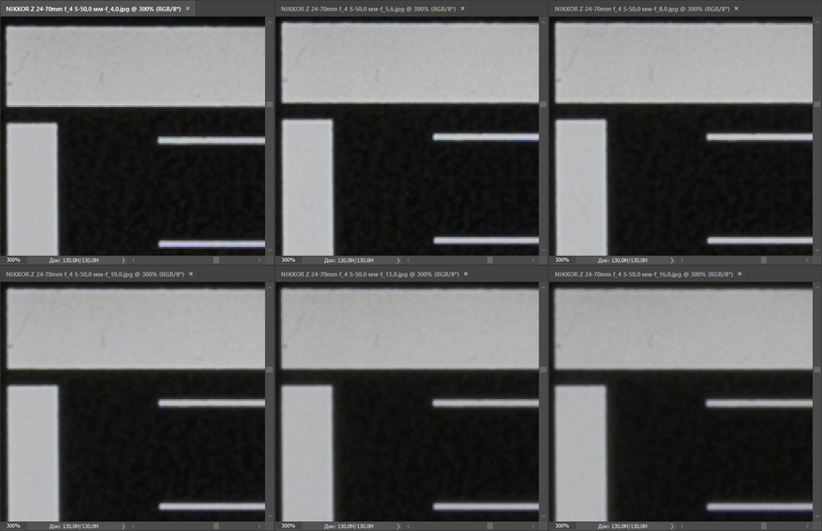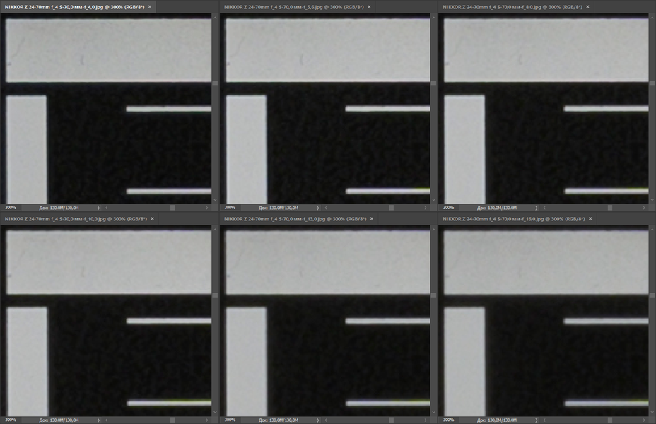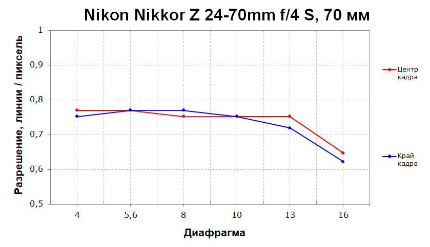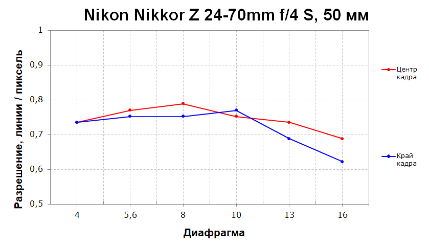 В среднем положении разрешающая способность, в целом, чуть меньше, но зато более стабильна — до 75% во всем диапазоне диафрагмирования, причем разница между краями и центром выравнивается.