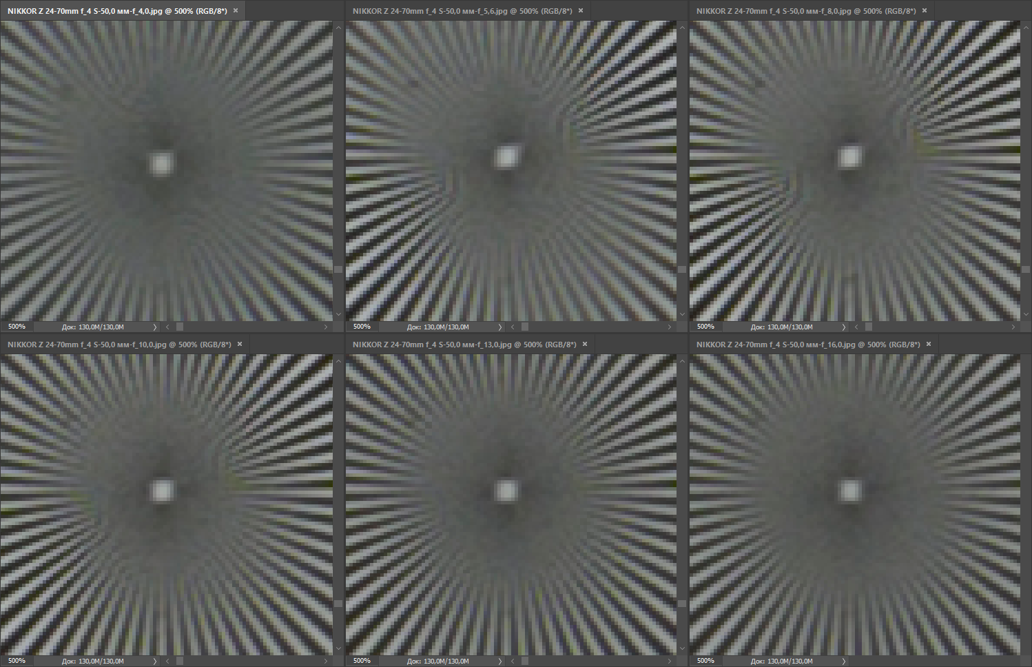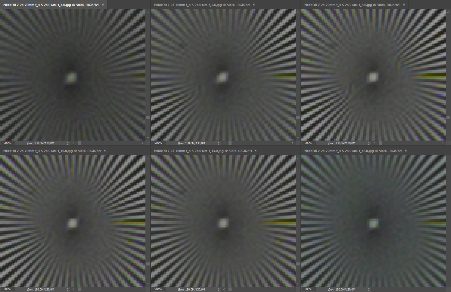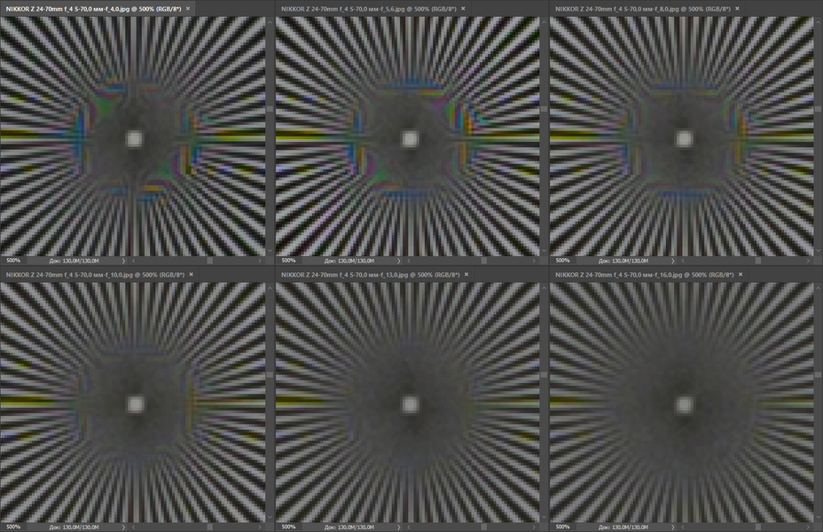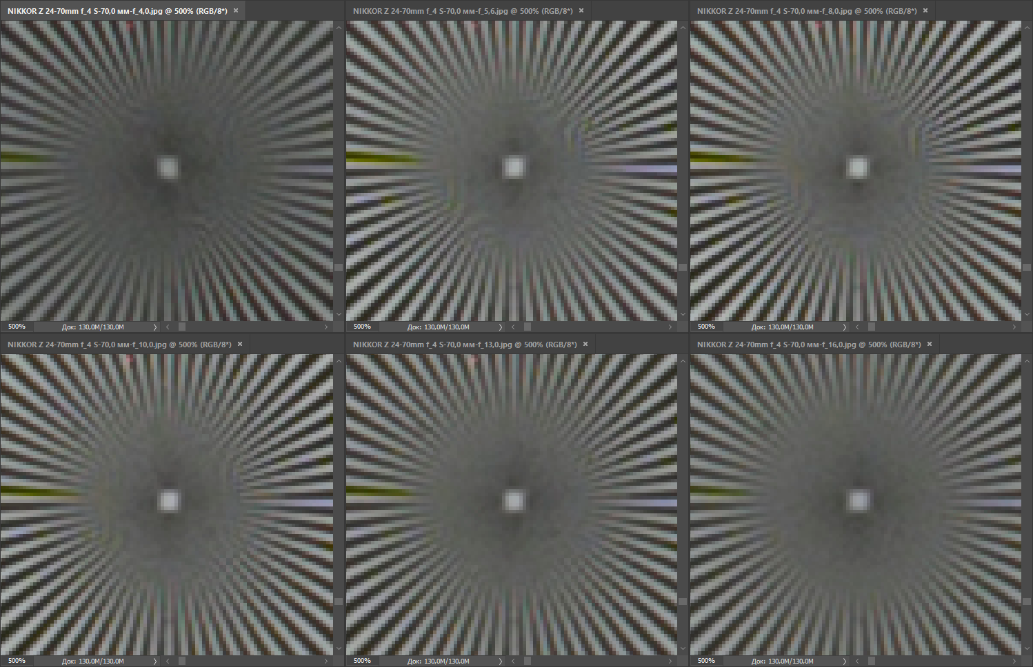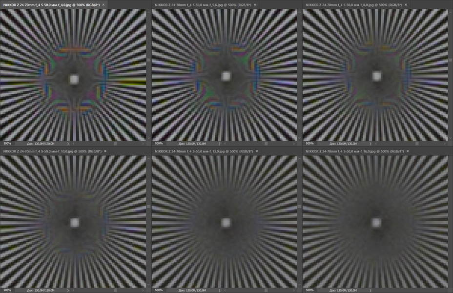 В среднем положении разрешающая способность, в целом, чуть меньше, но зато более стабильна — до 75% во всем диапазоне диафрагмирования, причем разница между краями и центром выравнивается.