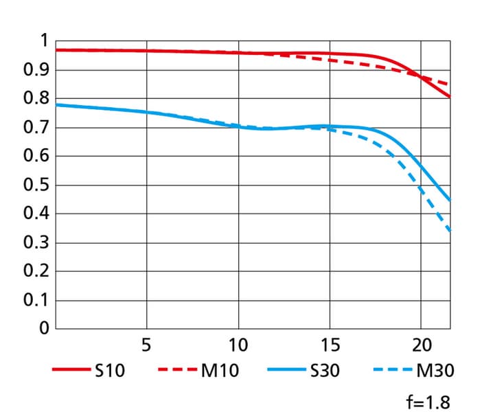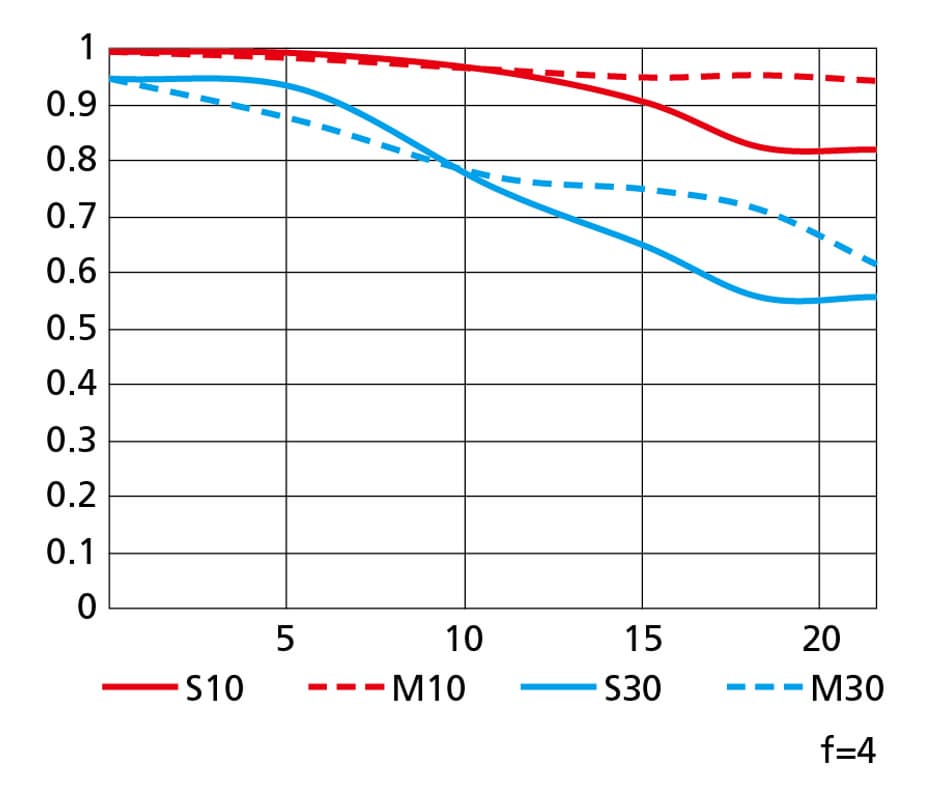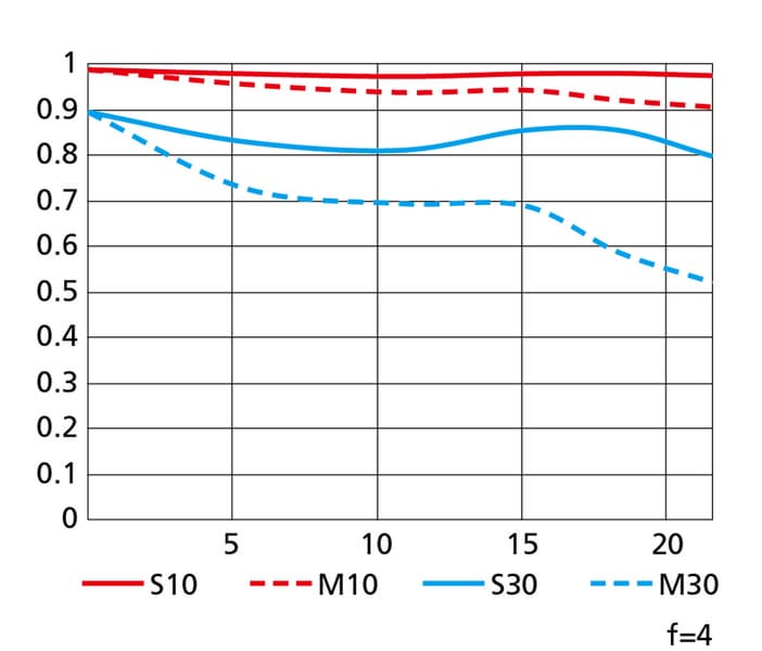 На сайте imaging.nikon.com производитель публикует кривые MTF (Modular Transfer Function), или частотно-контрастной характеристики объектива. Красным выделены графики для 10 линий/мм, синим — для 30 линий/мм; сплошные линии — для сагиттальных структур, пунктирные — для меридиональных.