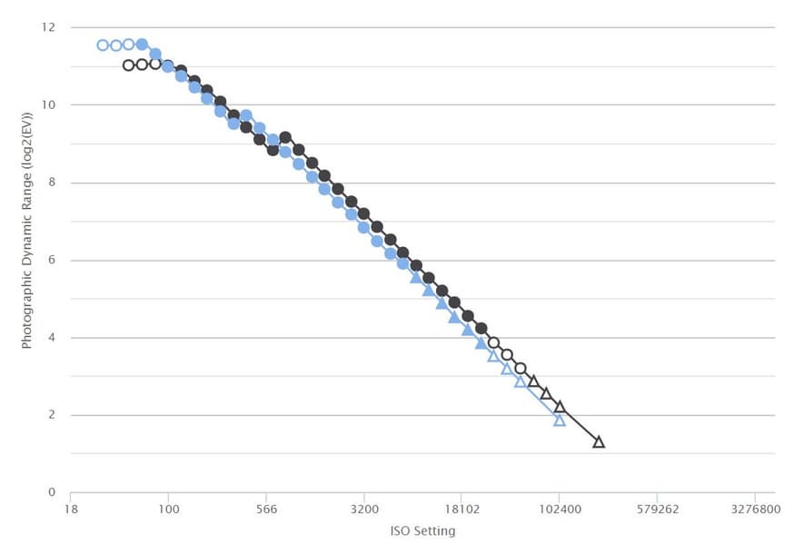 Картина вполне ожидаемая: при минимальных значениях ISO (в том числе, расширенных) Nikon Z7 демонстрирует более широкий ДД, при ISO 100—400 Nikon Z6 выходит вперед, уступает Nikon Z7 при ISO 400—600 и вновь лидирует при дальнейшем росте эквивалентной светочувствительности вплоть до максимально возможных значений.