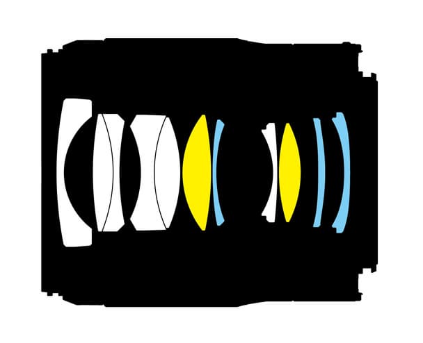 В конструкции объектива — 11 элементов в 9 группах, включая 2 элемента из сверхнизкодисперсионного стекла (ED, на схеме выделены желтым), три асферические линзы (голубые) и элементы с покрытием Nano Crystal Coat.