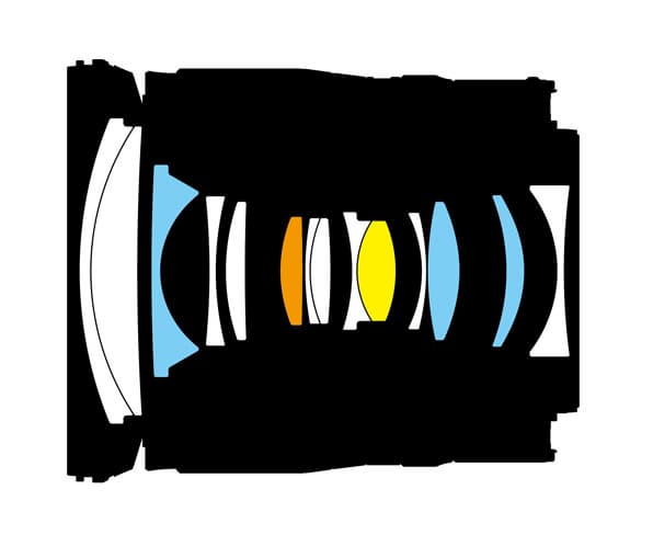 В конструкции объектива — 14 элементов, объединенные в 11 групп. Один элемент изготавливается из сверхнизкодисперсионного стекла (ED, на схеме выделен желтым цветом), один — асферический со сверхнизкой дисперсией (оранжевый) и три асферические линзы (голубые). Помимо этого некоторые элементы обладают «фирменным» покрытием производителя, известным как Nano Crystal Coat, а на переднюю линзу нанесено еще и флюоридное просветление.