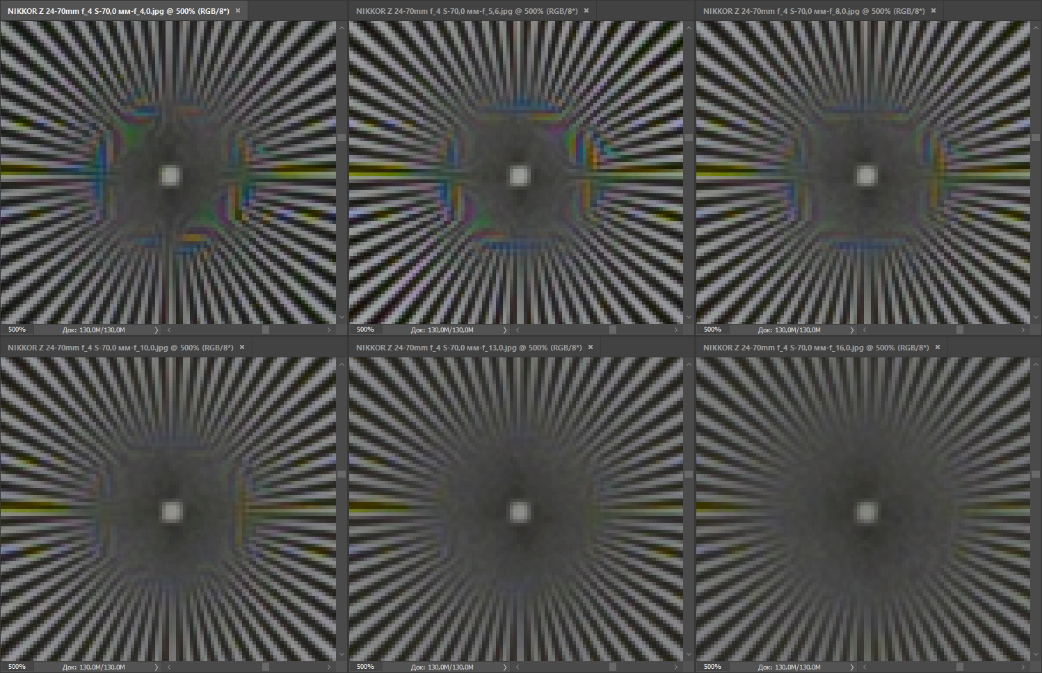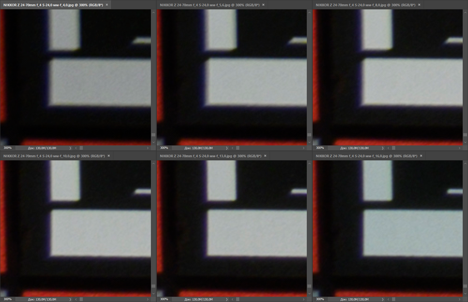 По стабильности разрешающей способности объектив очень хорош. Конечно, как всегда, разрешение могло бы быть выше, но 80% практически по всему полю кадра и во всем диапазоне — это тоже немало. Лишь на открытой и закрытой диафрагмах детализация понижается до 70% в центре и на краях.