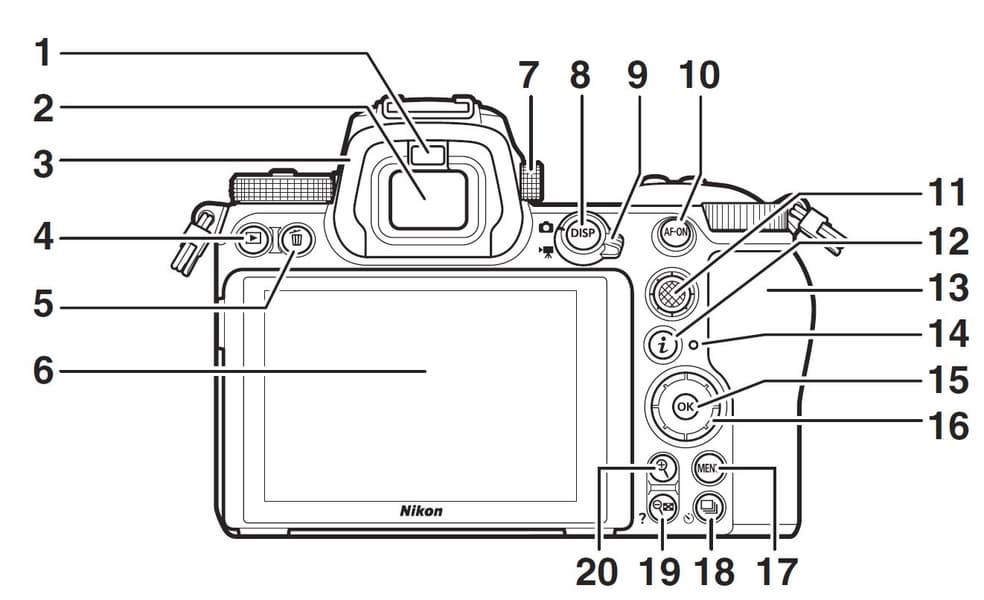 1 — датчик освещенности (для автоматического переключения вывода картинки в видоискатель); 2 — окуляр; 3 — наглазник видоискателя; 4 — кнопка просмотра отснятого материала; 5 — кнопка стирания; 6 — дисплей; 7 — регулятор диоптрийной коррекции видоискателя; 8 — кнопка активации LiveView; 9 — переключатель режима съемки между фото и видео; 10 — кнопка принудительной автофокусировки; 11 — джойстик; 12 — кнопка вызова панели параметров; 13 — крышка отсека со слотом для карты памяти; 14 — светодиодный индикатор записи на карту; 15 — кнопка подтверждения; 16 — мультиселектор; 17 — кнопка вызова меню; 18 — кнопка активации серийной съемки и автоспуска; 19 — кнопка уменьшения масштаба изображения; 20 — кнопка увеличения масштаба изображения.