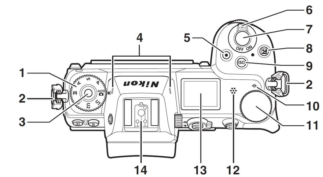 1 — селектор режимов съемки; 2 — крепление для шейного ремня; 3 — фиксатор селектора режимов; 4 — отверстия встроенного конденсаторного стереомикрофона; 5 — кнопка записи видео; 6 — выключатель питания; 7 — спуск затвора; 8 — кнопка ввода экспокоррекции; 9 — кнопка установки ISO; 10 — маркер фокальной плоскости сенсора; 11 — заднее управляющее колесо; 12 — отверстия динамика; 13 — дополнительный информационный дисплей; 14 — «горячий башмак».