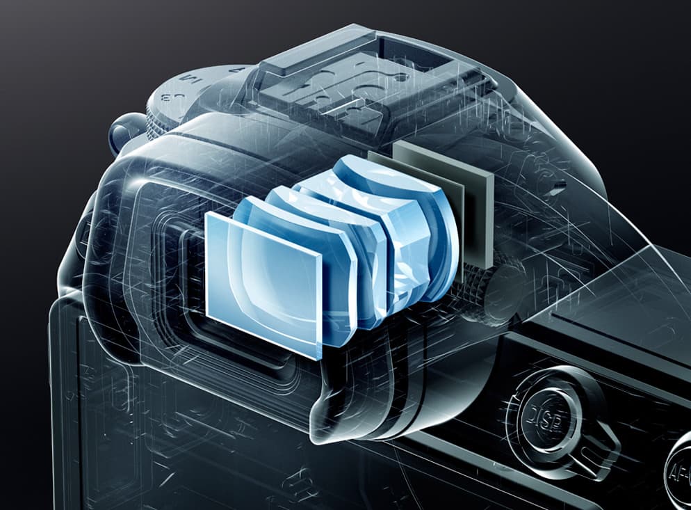 За наружным защитным стеклом окуляра, обращенным к глазу фотографа, располагаются четыре линзовых элемента, фильтр и собственно микродисплей, формирующий изображение. На защитное стекло нанесено флюоридное просветляющее покрытие, которое дает возможность подавить паразитные отражения с поверхностей стекла, известные в обиходе как «зайцы». Кроме того, оно обладает пылеотталкивающими свойствами. Предусмотрено перемещение линз для подстройки силы рефракции оптической системы в пределах от −4 дптр для близоруких до +2 дптр для дальнозорких.