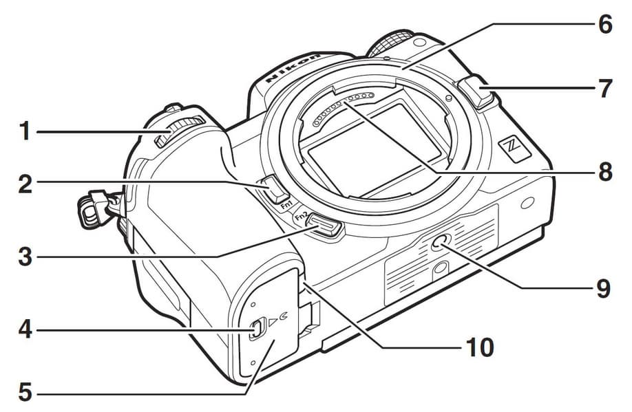 1 — переднее колесо управления; 2 — функциональная кнопка Fn1; 3 — функциональная кнопка Fn2; 4 — замок крышки отсека для батареи; 5 — крышка отсека для батареи; 6 — байонетное крепление для объектива; 7 — кнопка замка байонета; 8 — контакты для объектива; 9 — резьба для штатива; 10 — заглушка выемки для кабеля питания.