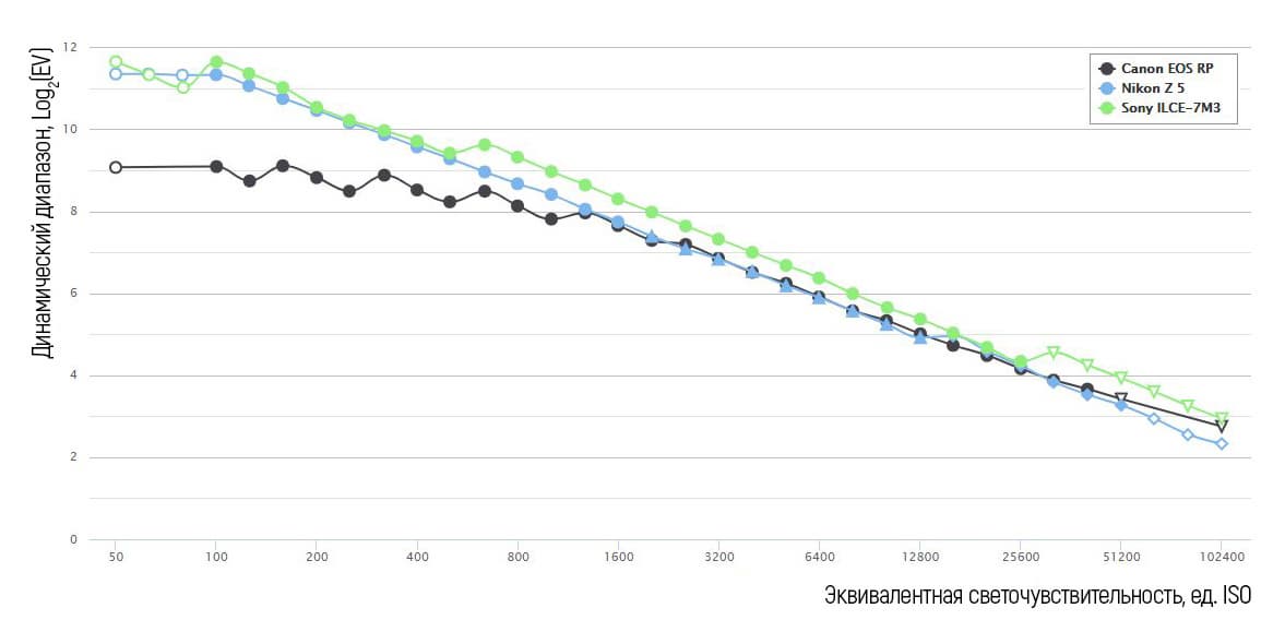 Бесспорным лидером является конкурент от Sony, а Nikon Z5 по показателю ДД занимает промежуточное положение. Canon EOS RP примерно соответствует Nikon Z5 при ISO 1200—12800, но при низких и умеренных значениях эквивалентной светочувствительности (ISO 50—800) заметно проигрывает остальным участникам соревнования.