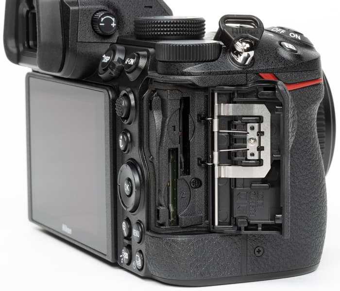 В отличие от большинства других любительских аппаратов Nikon Z5 располагает не одним, а двумя слотами для карт памяти распространенного типа SD/SDHC/SDXC, причем каждый слот поддерживает высокоскоростной интерфейс UHS-II.