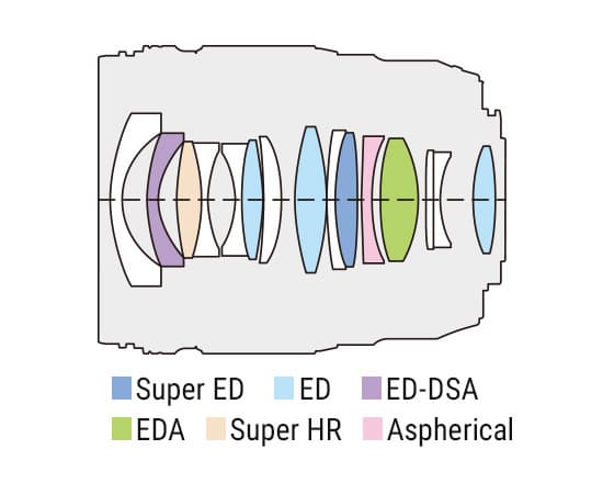 | Оптическая схема | 15 элементов в 11 группах, включая 3 линзы из высокодисперсионного и 1 из сверхвысокодисперсионного стекла и по одному ED-DSA, EDA, Super HR и асферическому элементу |