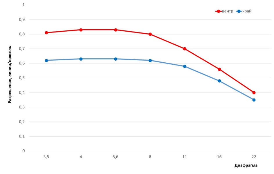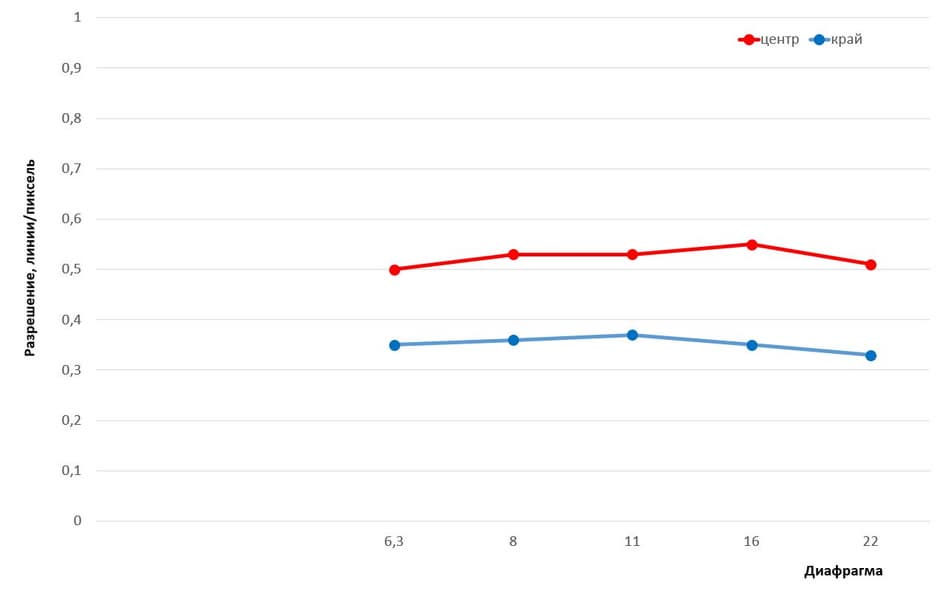 По сравнению с фокусным 12 мм разрешающая способность снижена на 35%, сохраняется заметный разрыв между центром и периферией кадра, но рабочий диапазон соответствует всему доступному диапазону диафрагмирования.