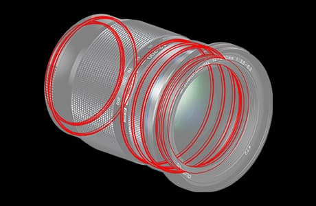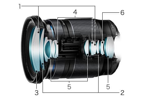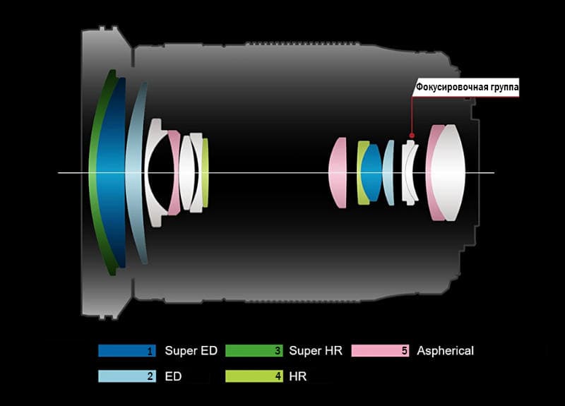 Оптическая схема состоит из 16 элементов, объединенных в 11 групп, и включает три асферических, два высокодисперсионных (ED), два высокорефрактивных (HR), два особо высокодисперсионных (Super ED) и один с особо высокой рефракцией (Super HR).